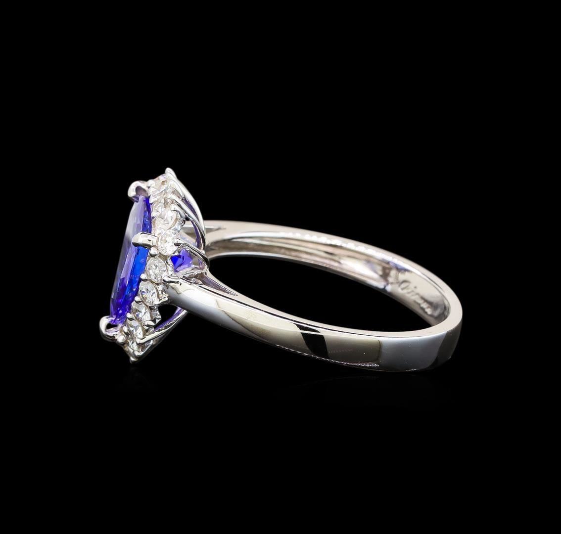 One electronically tested 14KT white gold ladies cast tanzanite and diamond ring with a cathedral shank with a bright polish finish. Trademark is Orianne. Identified with markings of "14K". Condition is new. Containing: One prong set triangle modified brilliant cut natural tanzanite, measuring 10.00 x 10.00 x 4.58mm, approximate weight of 2.76ct., clarity is eye clean, type I, medium light, very slightly grayish, violet color, (GIA V 4/3), cut is good. Eighteen prong set round brilliant cut diamonds, measuring 1.50 - 1.50 x 0.90mm (depth est.) approximate total weight of 18 Stones = 0.22ct. Clarity: SI-2 to I-1. Color: I - J, Cut is Good. All diamonds and colored gemstones are graded in the mounting, unless otherwise stated. Colored gemstones are presumed to have been subjected to commonly used enhancement processes. Total Weight of Colored Stones 2.76ct. Total Weight of Diamonds 0.22ct. Total Weight of Ring 3.10 grams. GGL Appraised at $3,495.00.