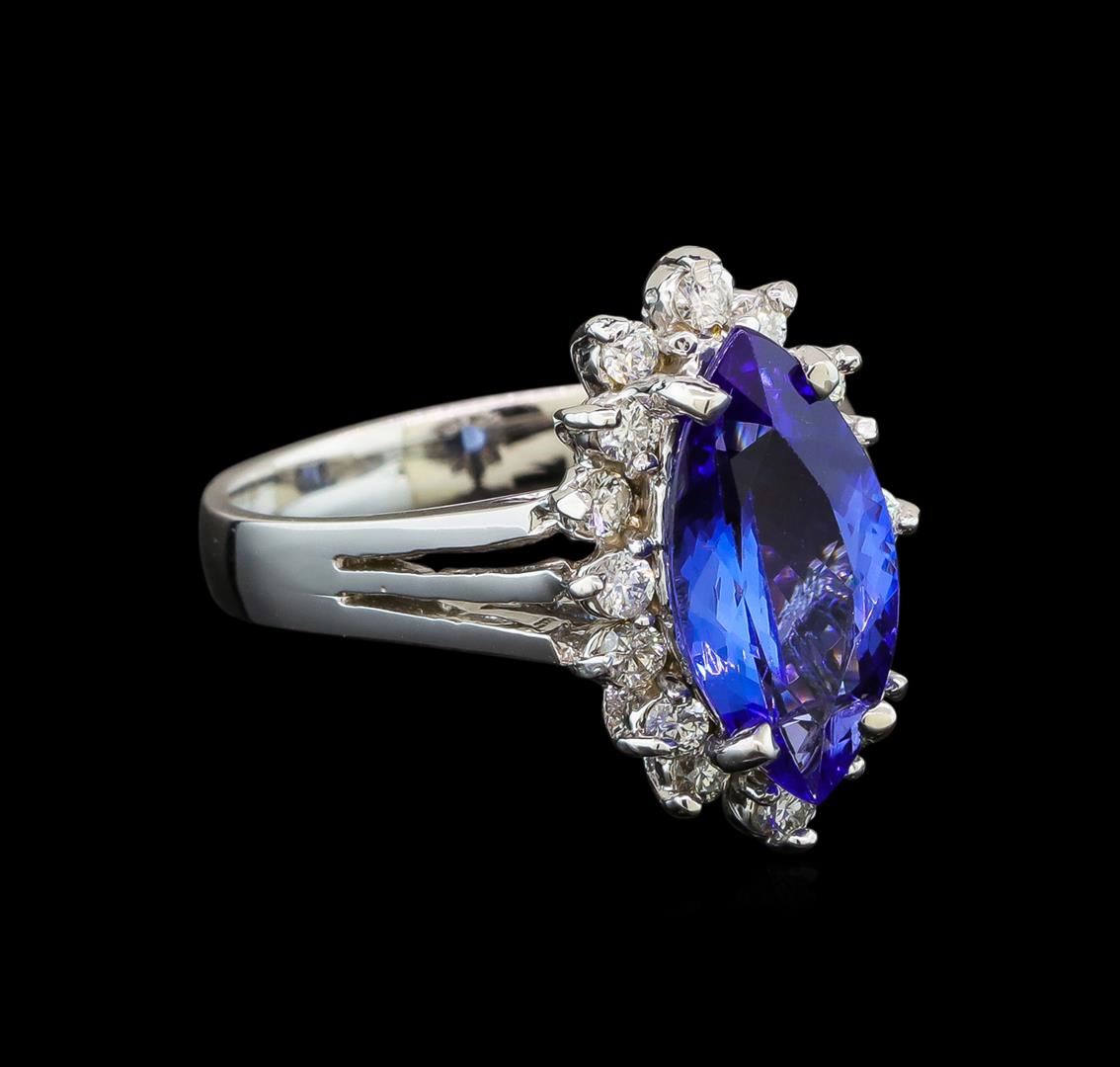 One electronically tested 14KT white gold ladies cast tanzanite and diamond ring with a bright polish finish. Identified with markings of "K14". Condition is new. Containing: One prong set marquise modified brilliant cut natural tanzanite, measuring 14.00 x 7.20 x 4.30mm, approximate weight of 2.76ct., clarity is eye clean, type I, medium, very slightly grayish, bluish violet color, (GIA bV 5/3), cut is good. Sixteen prong set round brilliant cut diamonds, measuring 2.00 - 2.00 x 1.20mm (depth est.) approximate total weight of 16 Stones = 0.47ct. Clarity: SI-1 to SI-2. Color: I - J, Cut is Good. Colored gemstones are presumed to have been subjected to commonly used enhancement processes. All diamonds and colored gemstones are graded in the mounting, unless otherwise stated. Total Weight of Colored Stones 2.76ct. Total Weight of Diamonds 0.47ct. Total Weight of Ring 5.20 grams. GGL Appraised at $4,000.00.