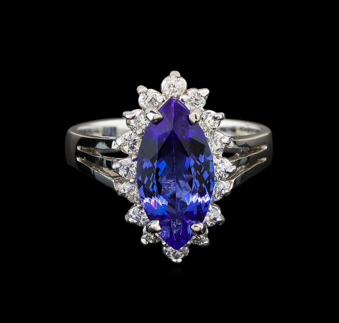One electronically tested 14KT white gold ladies cast tanzanite and diamond ring with a bright polish finish. Identified with markings of "K14". Condition is new. Containing: One prong set marquise modified brilliant cut natural tanzanite, measuring 14.00 x 7.20 x 4.30mm, approximate weight of 2.76ct., clarity is eye clean, type I, medium, very slightly grayish, bluish violet color, (GIA bV 5/3), cut is good. Sixteen prong set round brilliant cut diamonds, measuring 2.00 - 2.00 x 1.20mm (depth est.) approximate total weight of 16 Stones = 0.47ct. Clarity: SI-1 to SI-2. Color: I - J, Cut is Good. Colored gemstones are presumed to have been subjected to commonly used enhancement processes. All diamonds and colored gemstones are graded in the mounting, unless otherwise stated. Total Weight of Colored Stones 2.76ct. Total Weight of Diamonds 0.47ct. Total Weight of Ring 5.20 grams. GGL Appraised at $4,000.00.
