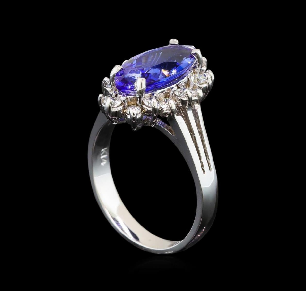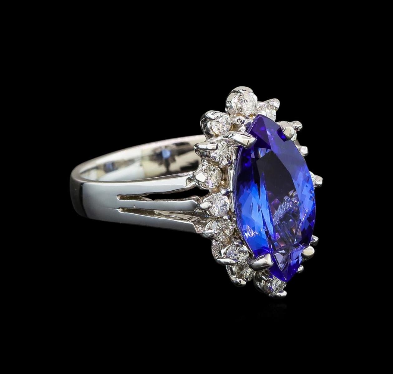 One electronically tested 14KT white gold ladies cast tanzanite and diamond ring with a bright polish finish. Identified with markings of "K14". Condition is new. Containing: One prong set marquise modified brilliant cut natural tanzanite, measuring 14.00 x 7.20 x 4.30mm, approximate weight of 2.76ct., clarity is eye clean, type I, medium, very slightly grayish, bluish violet color, (GIA bV 5/3), cut is good. Sixteen prong set round brilliant cut diamonds, measuring 2.00 - 2.00 x 1.20mm (depth est.) approximate total weight of 16 Stones = 0.47ct. Clarity: SI-1 to SI-2. Color: I - J, Cut is Good. Colored gemstones are presumed to have been subjected to commonly used enhancement processes. All diamonds and colored gemstones are graded in the mounting, unless otherwise stated. Total Weight of Colored Stones 2.76ct. Total Weight of Diamonds 0.47ct. Total Weight of Ring 5.20 grams. GGL Appraised.