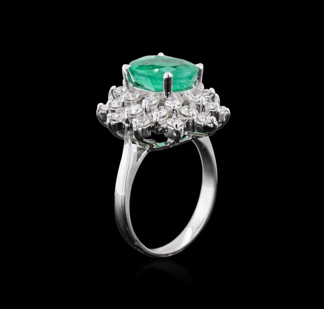 One electronically tested 14KT white gold ladies cast emerald and diamond ring with a cathedral shank with a bright polish finish. Identified with markings of "K14". Condition is new. Containing: One prong set oval modified brilliant cut natural emerald, measuring 10.86 x 7.95 x 5.00mm, exact weight 2.77ct., clarity is heavily included, type III, medium light, very slightly grayish, green color, (GIA G 4/3), cut is good. Thirty prong set round brilliant cut diamonds, measuring 2.30 - 2.00 x 1.29mm (depth est.) exact total weight 30 Stones = 1.33ct. Clarity: SI-1 to I-1. Color: H - I, Cut is Good. All diamonds and colored gemstones are graded in the mounting, unless otherwise stated. Colored gemstones are presumed to have been subjected to commonly used enhancement processes. Total Weight of Colored Stones 2.77ct. Total Weight of Diamonds 1.33ct. Total Weight of Ring 6.30 grams. GGL Appraised at $4,480.00.