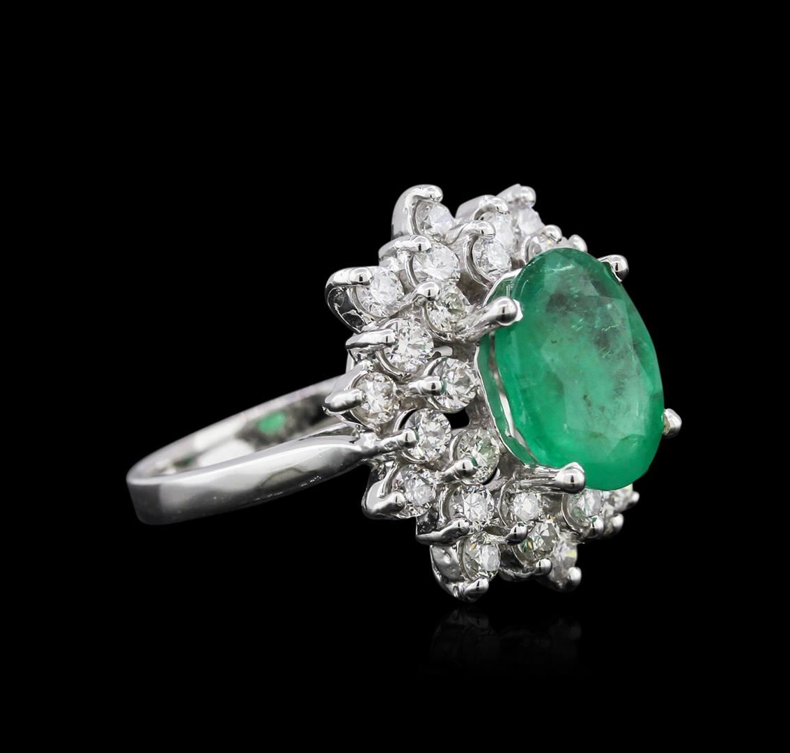 One electronically tested 14KT white gold ladies cast emerald and diamond ring with a cathedral shank with a bright polish finish. Identified with markings of "K14". Condition is new. Containing: One prong set oval modified brilliant cut natural emerald, measuring 10.86 x 7.95 x 5.00mm, exact weight 2.77ct., clarity is heavily included, type III, medium light, very slightly grayish, green color, (GIA G 4/3), cut is good. Thirty prong set round brilliant cut diamonds, measuring 2.30 - 2.00 x 1.29mm (depth est.) exact total weight 30 Stones = 1.33ct. Clarity: SI-1 to I-1. Color: H - I, Cut is Good. All diamonds and colored gemstones are graded in the mounting, unless otherwise stated. Colored gemstones are presumed to have been subjected to commonly used enhancement processes. Total Weight of Colored Stones 2.77ct. Total Weight of Diamonds 1.33ct. Total Weight of Ring 6.30 grams. GGL Appraised at $4,480.00.