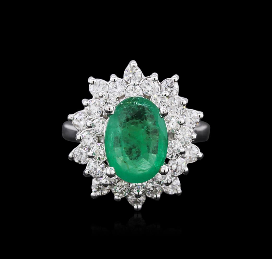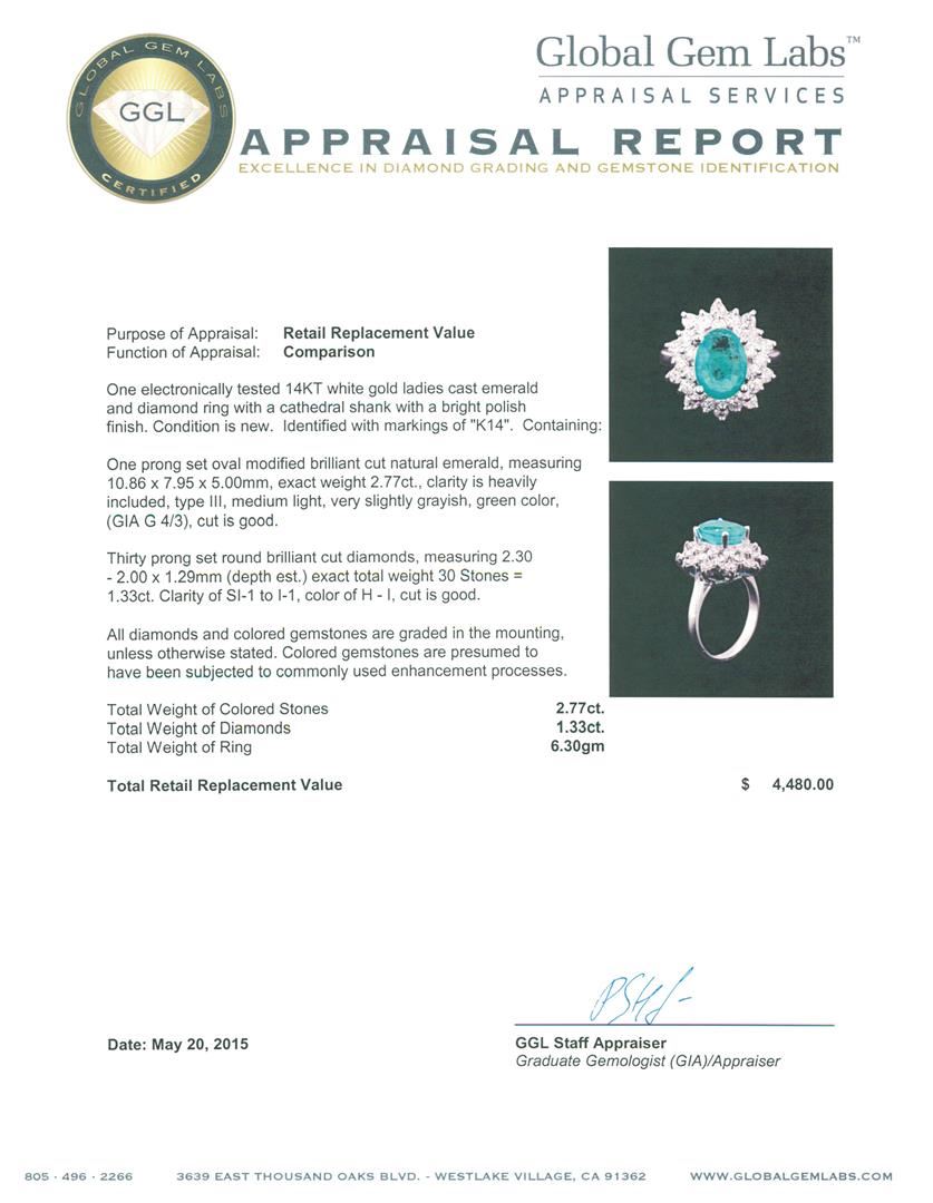 One electronically tested 14KT white gold ladies cast emerald and diamond ring with a cathedral shank with a bright polish finish. Identified with markings of "K14". Condition is new. Containing: One prong set oval modified brilliant cut natural emerald, measuring 10.86 x 7.95 x 5.00mm, exact weight 2.77ct., clarity is heavily included, type III, medium light, very slightly grayish, green color, (GIA G 4/3), cut is good. Thirty prong set round brilliant cut diamonds, measuring 2.30 - 2.00 x 1.29mm (depth est.) exact total weight 30 Stones = 1.33ct. Clarity: SI-1 to I-1. Color: H - I, Cut is Good. All diamonds and colored gemstones are graded in the mounting, unless otherwise stated. Colored gemstones are presumed to have been subjected to commonly used enhancement processes. Total Weight of Colored Stones 2.77ct. Total Weight of Diamonds 1.33ct. Total Weight of Ring 6.30 grams. GGL Appraised at $4,480.00.