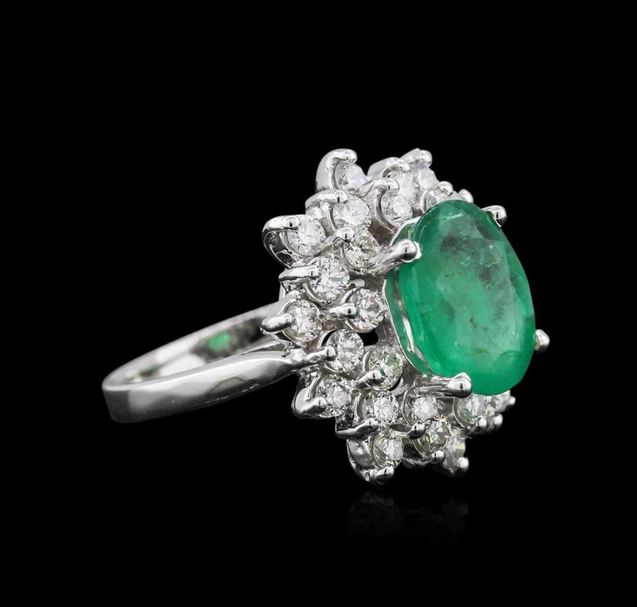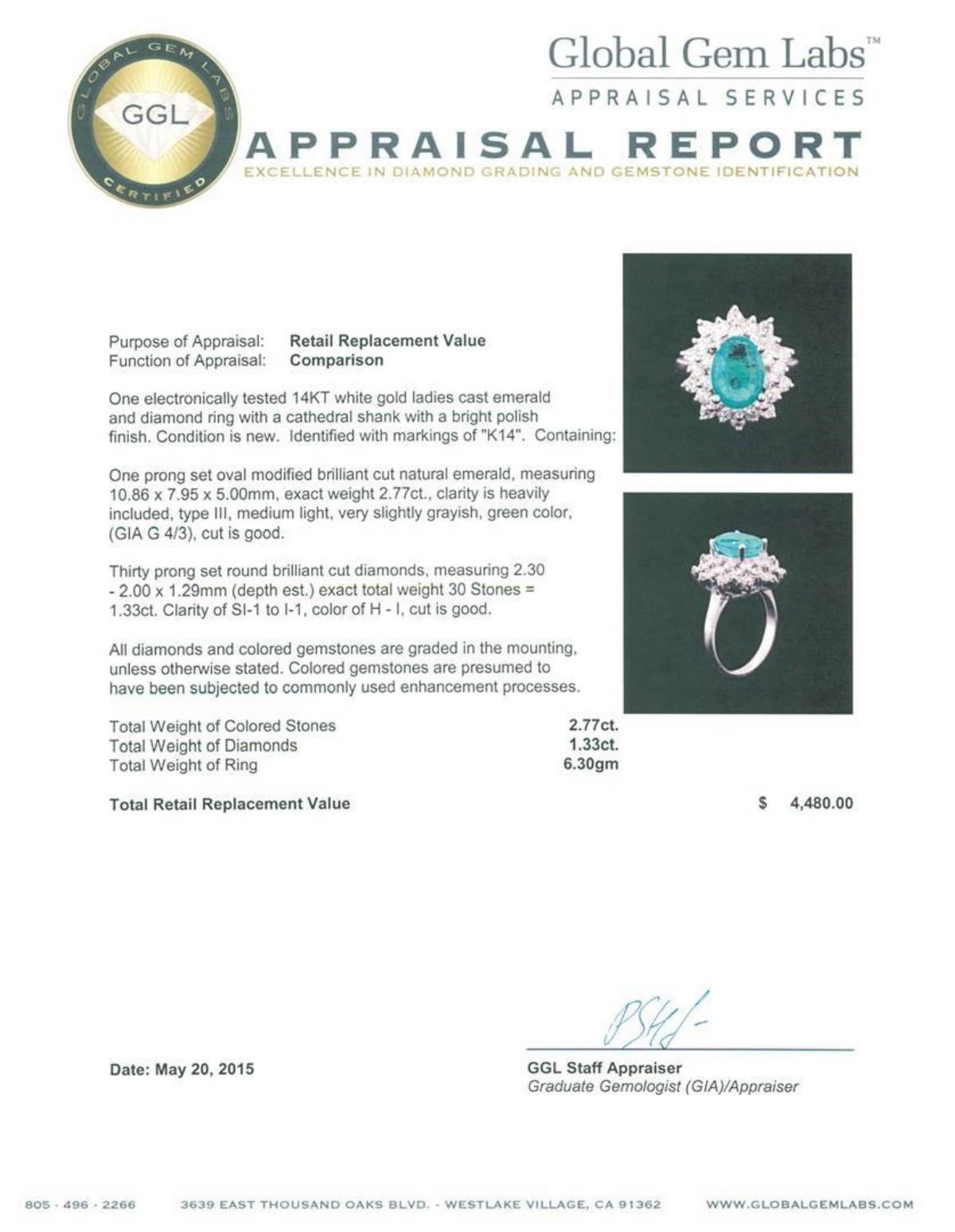 One electronically tested 14KT white gold ladies cast emerald and diamond ring with a cathedral shank with a bright polish finish. Identified with markings of "K14". Condition is new. Containing: One prong set oval modified brilliant cut natural emerald, measuring 10.86 x 7.95 x 5.00mm, exact weight 2.77ct., clarity is heavily included, type III, medium light, very slightly grayish, green color, (GIA G 4/3), cut is good. Thirty prong set round brilliant cut diamonds, measuring 2.30 - 2.00 x 1.29mm (depth est.) exact total weight 30 Stones = 1.33ct. Clarity: SI-1 to I-1. Color: H - I, Cut is Good. All diamonds and colored gemstones are graded in the mounting, unless otherwise stated. Colored gemstones are presumed to have been subjected to commonly used enhancement processes. Total Weight of Colored Stones 2.77ct. Total Weight of Diamonds 1.33ct. Total Weight of Ring 6.30 grams. GGL Appraised.