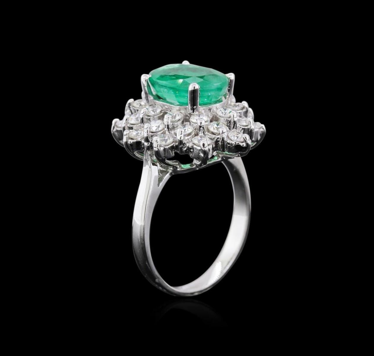 One electronically tested 14KT white gold ladies cast emerald and diamond ring with a cathedral shank with a bright polish finish. Identified with markings of "K14". Condition is new. Containing: One prong set oval modified brilliant cut natural emerald, measuring 10.86 x 7.95 x 5.00mm, exact weight 2.77ct., clarity is heavily included, type III, medium light, very slightly grayish, green color, (GIA G 4/3), cut is good. Thirty prong set round brilliant cut diamonds, measuring 2.30 - 2.00 x 1.29mm (depth est.) exact total weight 30 Stones = 1.33ct. Clarity: SI-1 to I-1. Color: H - I, Cut is Good. All diamonds and colored gemstones are graded in the mounting, unless otherwise stated. Colored gemstones are presumed to have been subjected to commonly used enhancement processes. Total Weight of Colored Stones 2.77ct. Total Weight of Diamonds 1.33ct. Total Weight of Ring 6.30 grams. GGL Appraised.