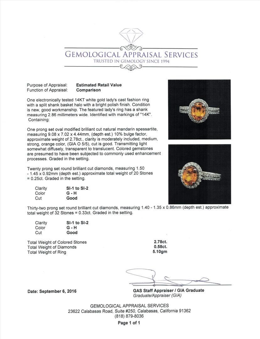One electronically tested 14KT white gold lady's cast fashion ring with a split shank basket halo with a bright polish finish. The featured lady's ring has a shank measuring 2.86 millimeters wide. Identified with markings of "14K". Condition is new, good workmanship. Containing: One prong set oval modified brilliant cut natural mandarin spessartite, measuring 9.08 x 7.02 x 4.44mm, (depth est.) 10%. bulge factor, approximate weight of 2.78ct., clarity is moderately included, medium, strong, orange color, (GIA O 5/5), cut is good. Transmitting light somewhat diffusely, transparent to translucent. Colored gemstones are presumed to have been subjected to commonly used enhancement processes. Graded in the setting.Twenty prong set round brilliant cut diamonds, measuring 1.50 - 1.45 x 0.92mm (depth est.) approximate total weight of 20 Stones = 0.25ct. Graded in the setting. Clarity: SI-1 to SI-2. Color: G - HCut Good Thirty-Two prong set round brilliant cut diamonds, measuring 1.40 - 1.35 x 0.86mm (depth est.) approximate total weight of 32 Stones = 0.33ct. Graded in the setting. Clarity: SI-1 to SI-2. Color: G - HCut Good. Total Weight of Colored Stones 2.78ct. Total Weight of Diamonds 0.58ct. Total Weight of Ring 5.10gm. GAS Appraised.
