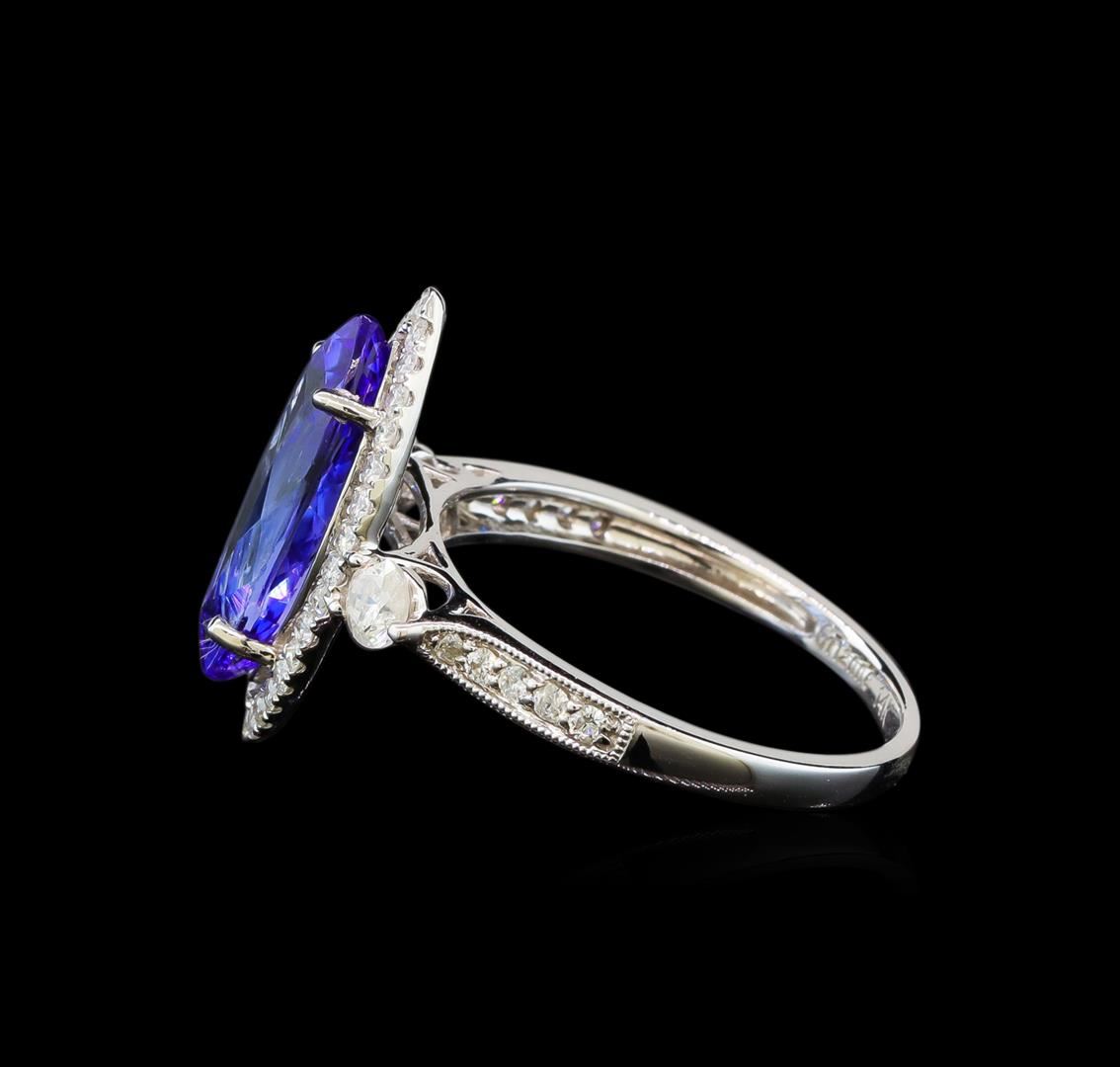 One electronically tested 14KT white gold ladies cast tanzanite and diamond ring with a bright polish finish. Identified with markings of "14K". Condition is new. Containing: One prong set marquise modified brilliant cut natural tanzanite, measuring 14.45 x 6.59 x 4.59mm, approximate weight of 2.78ct., clarity is eye clean, type I, medium, moderately strong, violet color, (GIA V 5/4), cut is good. Two prong set round brilliant cut diamonds, measuring 3.50 - 3.50 x 2.10mm (depth est.) approximate total weight of 2 Stones = 0.31ct. Clarity: I-1 to I-2. Color: I - J. Forty-Two prong set round brilliant cut diamonds, measuring 1.20 - 1.20 x 0.72mm (depth est.) approximate total weight of 42 Stones = 0.27ct. Clarity: SI-2 to I-1. Color: I - J, Cut is Good. Colored gemstones are presumed to have been subjected to commonly used enhancement processes. All diamonds and colored gemstones are graded in the mounting, unless otherwise stated. Total Weight of Colored Stones 2.78ct. Total Weight of Diamonds 0.58ct. Total Weight of Ring 3.10 grams. GGL Appraised at $3,755.00.
