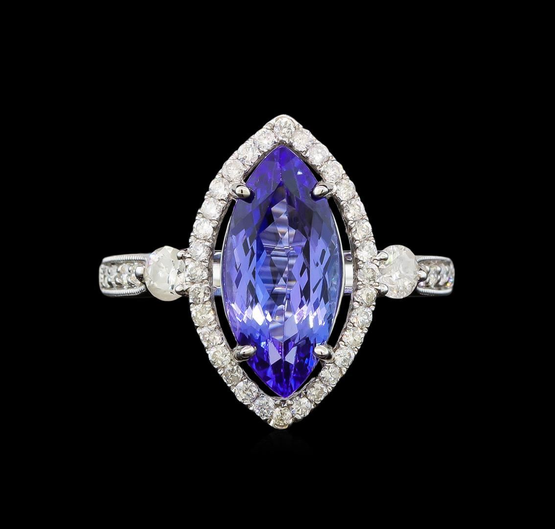 One electronically tested 14KT white gold ladies cast tanzanite and diamond ring with a bright polish finish. Identified with markings of "14K". Condition is new. Containing: One prong set marquise modified brilliant cut natural tanzanite, measuring 14.45 x 6.59 x 4.59mm, approximate weight of 2.78ct., clarity is eye clean, type I, medium, moderately strong, violet color, (GIA V 5/4), cut is good. Two prong set round brilliant cut diamonds, measuring 3.50 - 3.50 x 2.10mm (depth est.) approximate total weight of 2 Stones = 0.31ct. Clarity: I-1 to I-2. Color: I - J. Forty-Two prong set round brilliant cut diamonds, measuring 1.20 - 1.20 x 0.72mm (depth est.) approximate total weight of 42 Stones = 0.27ct. Clarity: SI-2 to I-1. Color: I - J, Cut is Good. Colored gemstones are presumed to have been subjected to commonly used enhancement processes. All diamonds and colored gemstones are graded in the mounting, unless otherwise stated. Total Weight of Colored Stones 2.78ct. Total Weight of Diamonds 0.58ct. Total Weight of Ring 3.10 grams. GGL Appraised at $3,755.00.