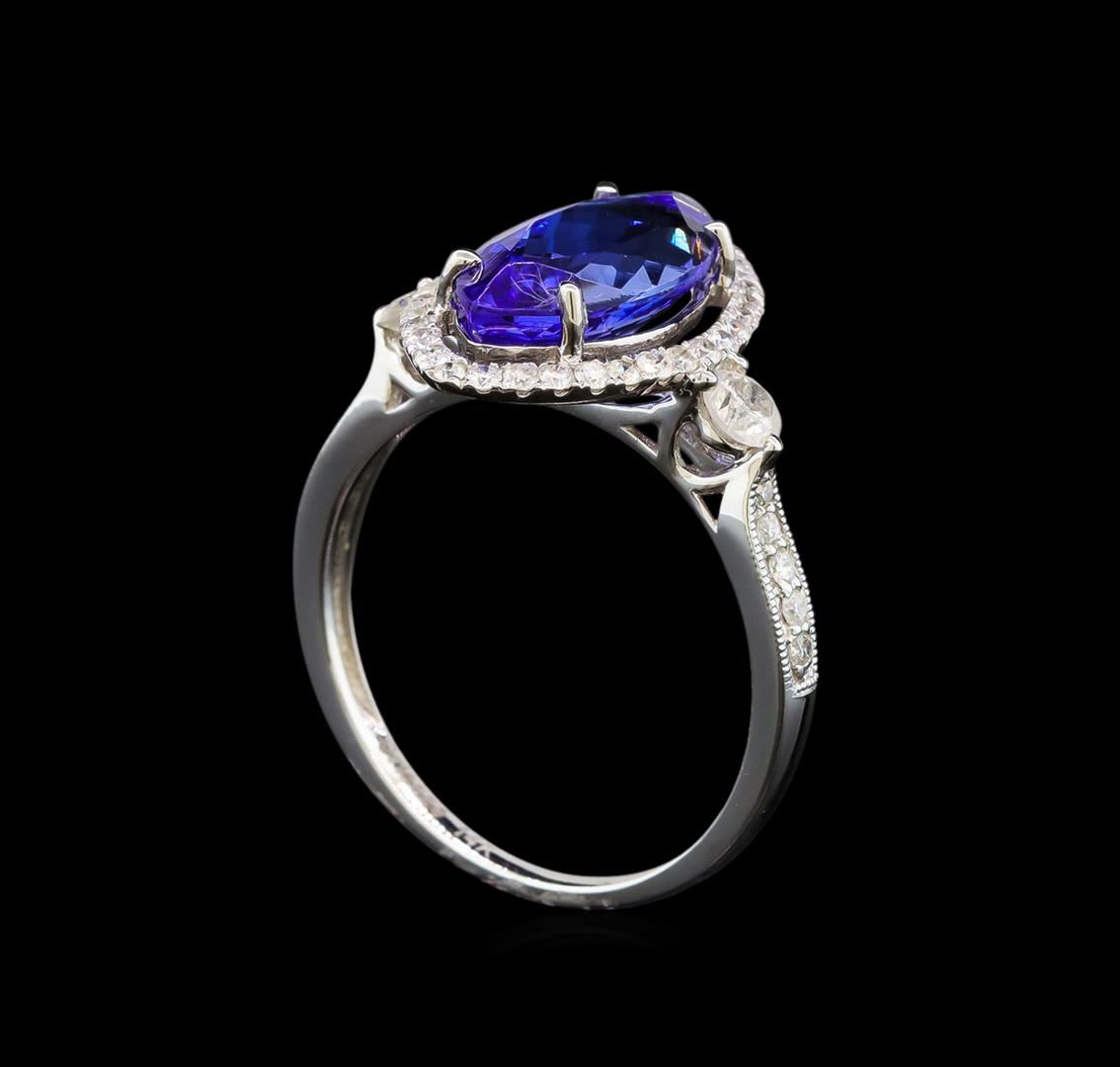 One electronically tested 14KT white gold ladies cast tanzanite and diamond ring with a bright polish finish. Identified with markings of "14K". Condition is new. Containing: One prong set marquise modified brilliant cut natural tanzanite, measuring 14.45 x 6.59 x 4.59mm, approximate weight of 2.78ct., clarity is eye clean, type I, medium, moderately strong, violet color, (GIA V 5/4), cut is good. Two prong set round brilliant cut diamonds, measuring 3.50 - 3.50 x 2.10mm (depth est.) approximate total weight of 2 Stones = 0.31ct. Clarity: I-1 to I-2. Color: I - J. Forty-Two prong set round brilliant cut diamonds, measuring 1.20 - 1.20 x 0.72mm (depth est.) approximate total weight of 42 Stones = 0.27ct. Clarity: SI-2 to I-1. Color: I - J, Cut is Good. Colored gemstones are presumed to have been subjected to commonly used enhancement processes. All diamonds and colored gemstones are graded in the mounting, unless otherwise stated. Total Weight of Colored Stones 2.78ct. Total Weight of Diamonds 0.58ct. Total Weight of Ring 3.10 grams. GGL Appraised.