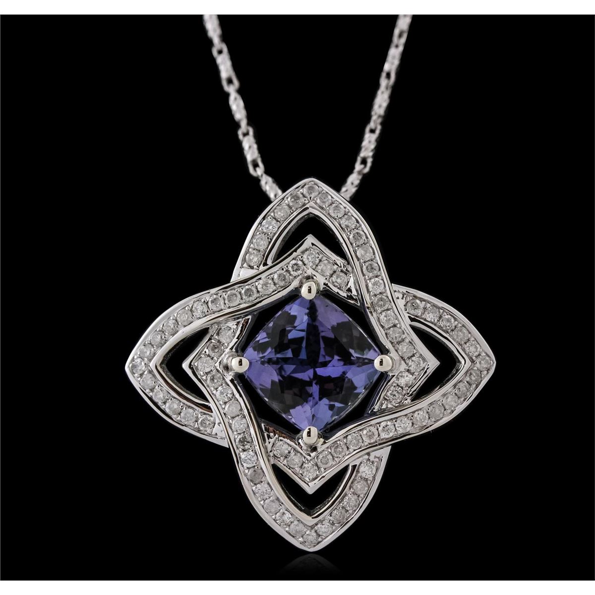 One electronically tested 14KT white gold ladies cast & assembled tanzanite and diamond pendant with chain. The pendant features a tanzanite set within intertwining diamond ribbons, completed by a hidden bail. The pendant is supported by an eighteen inch length 14KT white gold designer style chain, terminating in a lobster claw clasp. Bright polish finish. Trademark is Orianne. Identified with markings of "14K". Condition is new, good workmanship. Containing: One prong set square cushion brilliant cut natural tanzanite, measuring 8.10 x 8.00 x 5.15mm, 6% bulge factor, approximate weight of 2.78ct., clarity is eye clean, type I, medium dark, slightly grayish, bluish violet color, (GIA bV 6/2), cut is good. Transmitting light with no distortion, transparent. Graded in the setting. Tanzanite is a very rare gemstone that is only found in the country of Tanzania. Originally discovered in 1967. Tiffany & Company, named the stone Tanzanite. It is found in the Usumburu Mountains that border the Umba Valley of northern Tanzania. Tanzanite occurs in gray, brown, violet, blue, reddish-purple, & green. The gem is interesting because of its exceptional pleochroism. Rotated in different directions a tanzanite will exhibit multiple changes of color. Tanzanite has a low tolerance to ultrasonic cleaning, and should not be cleaned using this method. Eighty prong set round brilliant cut diamonds, measuring 1.20 - 1.10 x 0.69mm (depth est.) approximate total weight of 80 Stones = 0.54ct. Graded in the setting. Clarity: I-1 to I-3. Color: H - J. Total Weight of Colored Stones 2.78ct. Total Weight of Diamonds 0.54ct. Total Weight of Pendant With Chain 9.59 grams. AIG Appraised at $8,215.00.