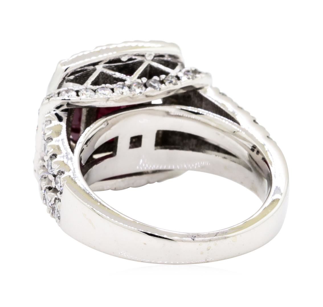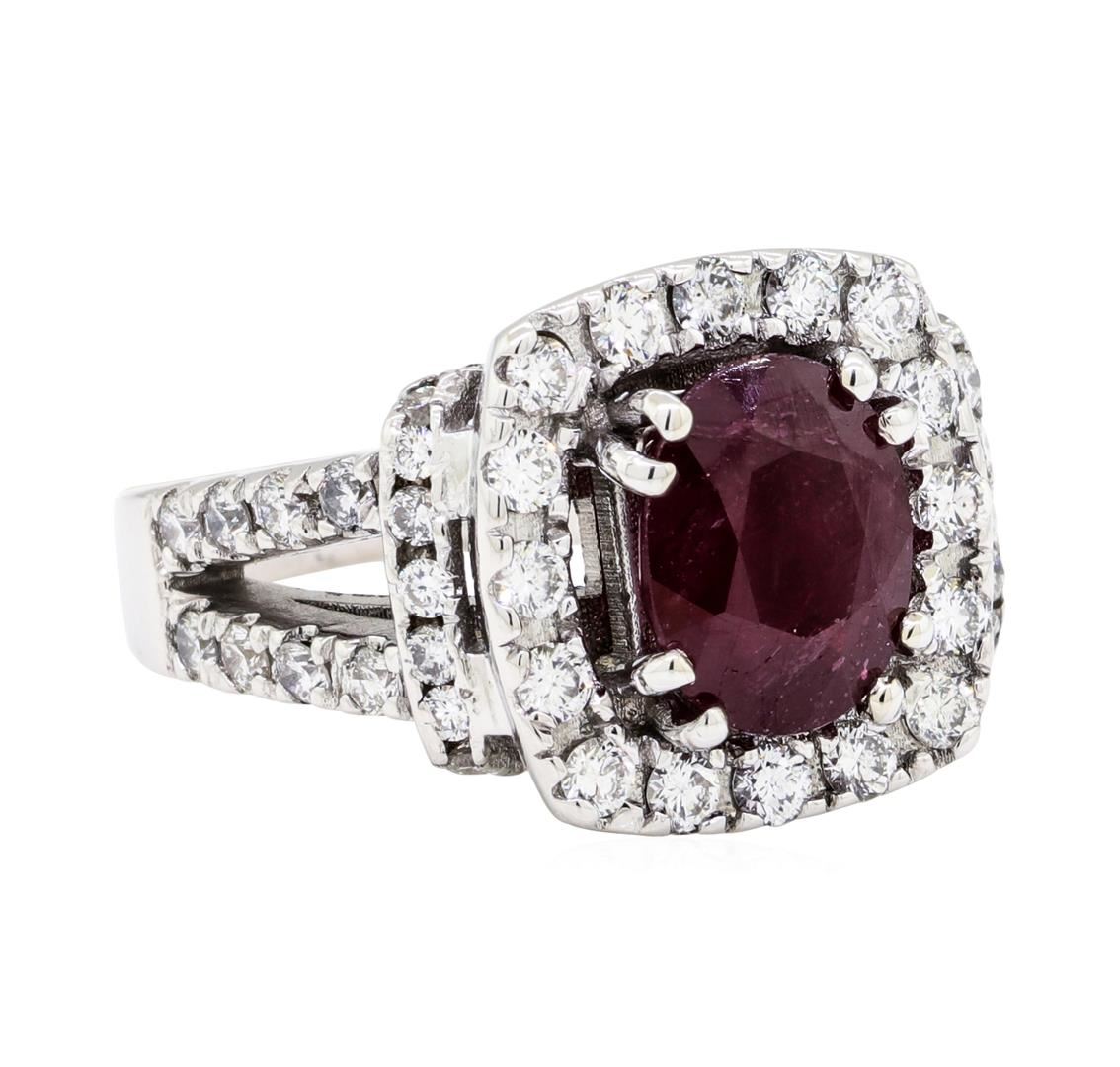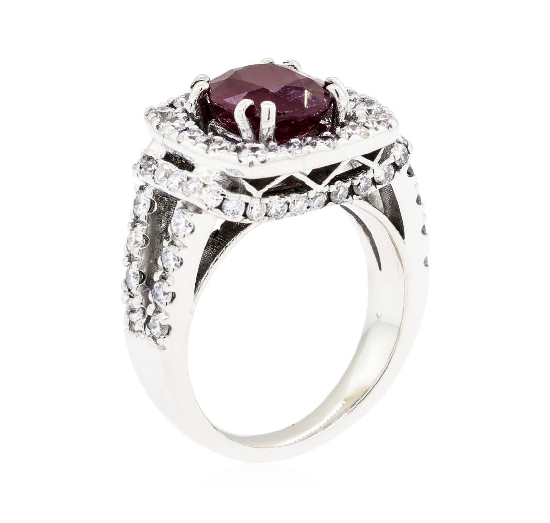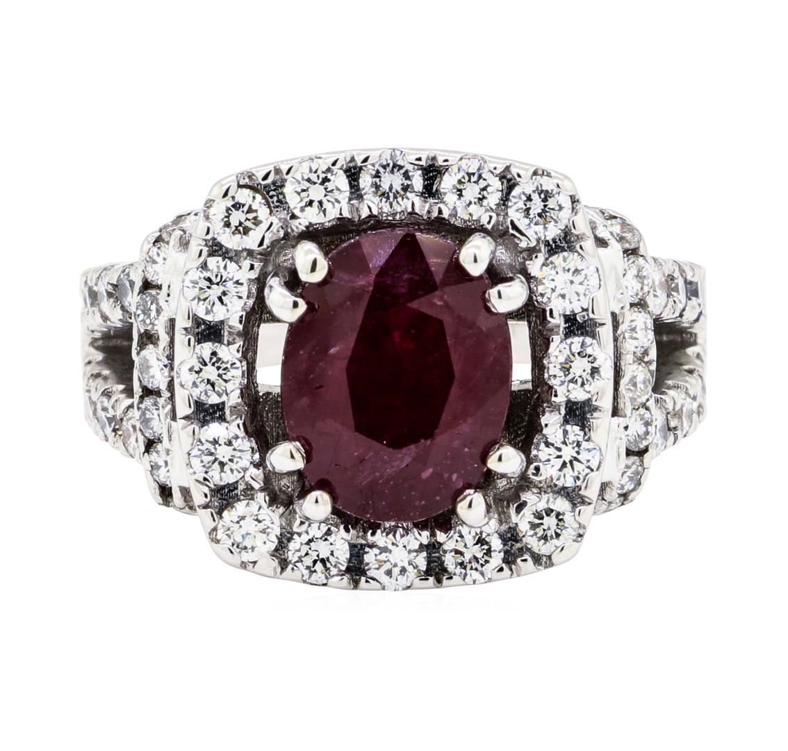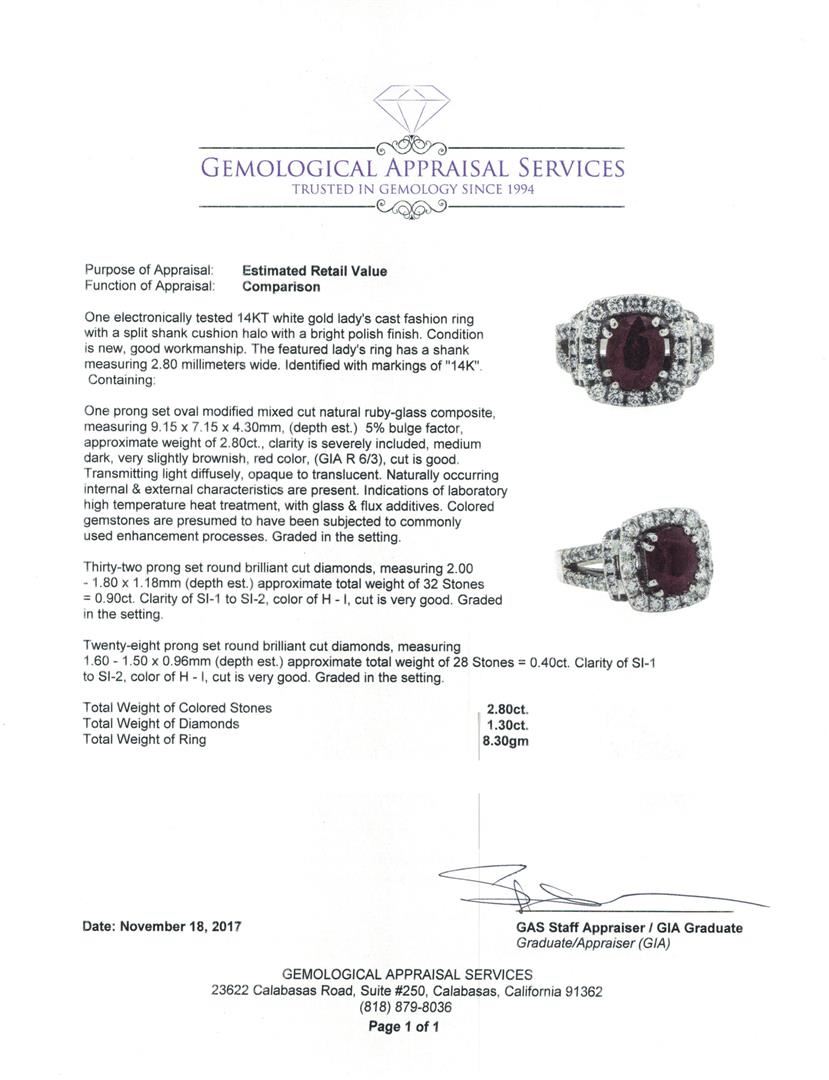 One electronically tested 14KT white gold lady's cast fashion ring with a split shank cushion halo with a bright polish finish. The featured lady's ring has a shank measuring 2.80 millimeters wide. Identified with markings of '14K'. Condition is new, good workmanship. Containing: One prong set oval modified mixed cut natural ruby-glass composite, measuring 9.15 x 7.15 x 4.30mm, (depth est.) 5%. bulge factor, approximate weight of 2.80ct., clarity is severely included, medium dark, very slightly brownish, red color, (GIA R 6/3), cut is good. Transmitting light diffusely, opaque to translucent. Naturally occurring internal & external characteristics are present. Indications of laboratory high temperature heat treatment, with glass & flux additives. Colored gemstones are presumed to have been subjected to commonly used enhancement processes. Graded in the setting. Thirty-Two prong set round brilliant cut diamonds, measuring 2.00 - 1.80 x 1.18mm (depth est.) approximate total weight of 32 Stones = 0.90ct. Graded in the setting. Color H - I Clarity SI-1 to SI-2 Cut Very Good Twenty-Eight prong set round brilliant cut diamonds, measuring 1.60 - 1.50 x 0.96mm (depth est.) approximate total weight of 28 Stones = 0.40ct. Graded in the setting. Color H - I Clarity SI-1 to SI-2 Cut Very Good. Total Weight of Colored Stones 2.80ct.. Total Weight of Diamonds 1.30ct.. Total Weight of Ring 8.30gm. GAS Appraised.