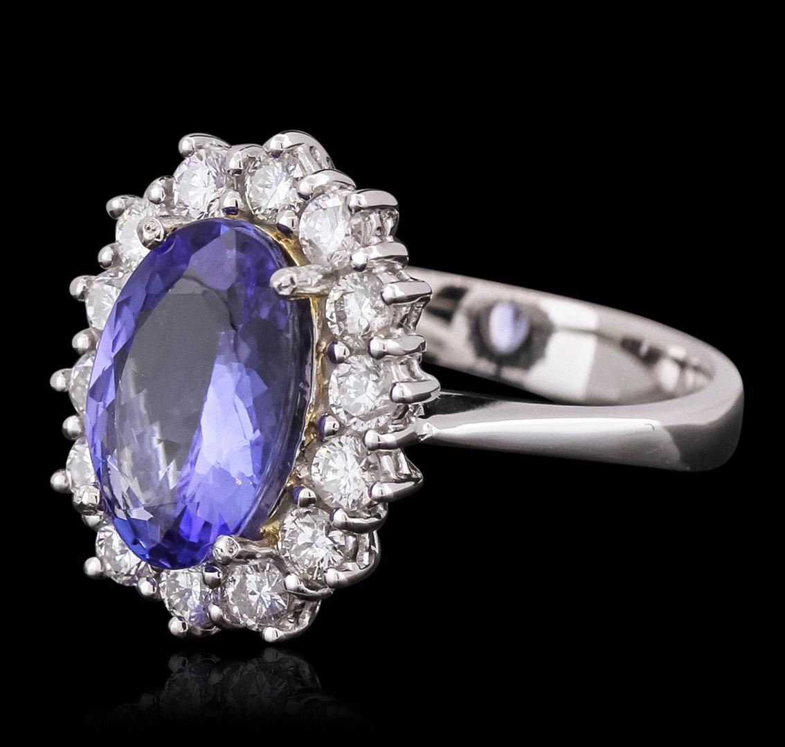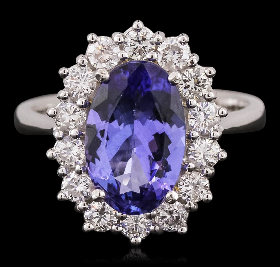 One electronically tested 14KT white gold ladies combination cast & assembled ring with a bright polish finish. Condition is new. Identified with markings of "14K". Containing: One prong set oval modified brilliant cut natural tanzanite, measuring 11.87 x 7.70 x 4.36mm, approximate weight of 2.80ct., clarity is eye clean, type I, medium, moderately strong, ciolet color, (GIA V 5/4), cut is good. Fourteen prong set round brilliant cut diamonds, measuring 2.50 - 2.50 x 1.50mm (depth est.) approximate total weight of 14 Stones = 0.80ct. Clarity of SI-1 to SI-2, color of H - I, cut is good. Colored gemstones are presumed to have been subjected to commonly used enhancement processes. All diamonds and colored gemstones are graded in the mounting, unless otherwise stated. Total Weight of Colored Stones 2.80ct. Total Weight of Diamonds 0.80ct. Total Weight of Ring 6.20 grams. GGL appraised at $7,980.00. GGL Appraised at $7,980.00.