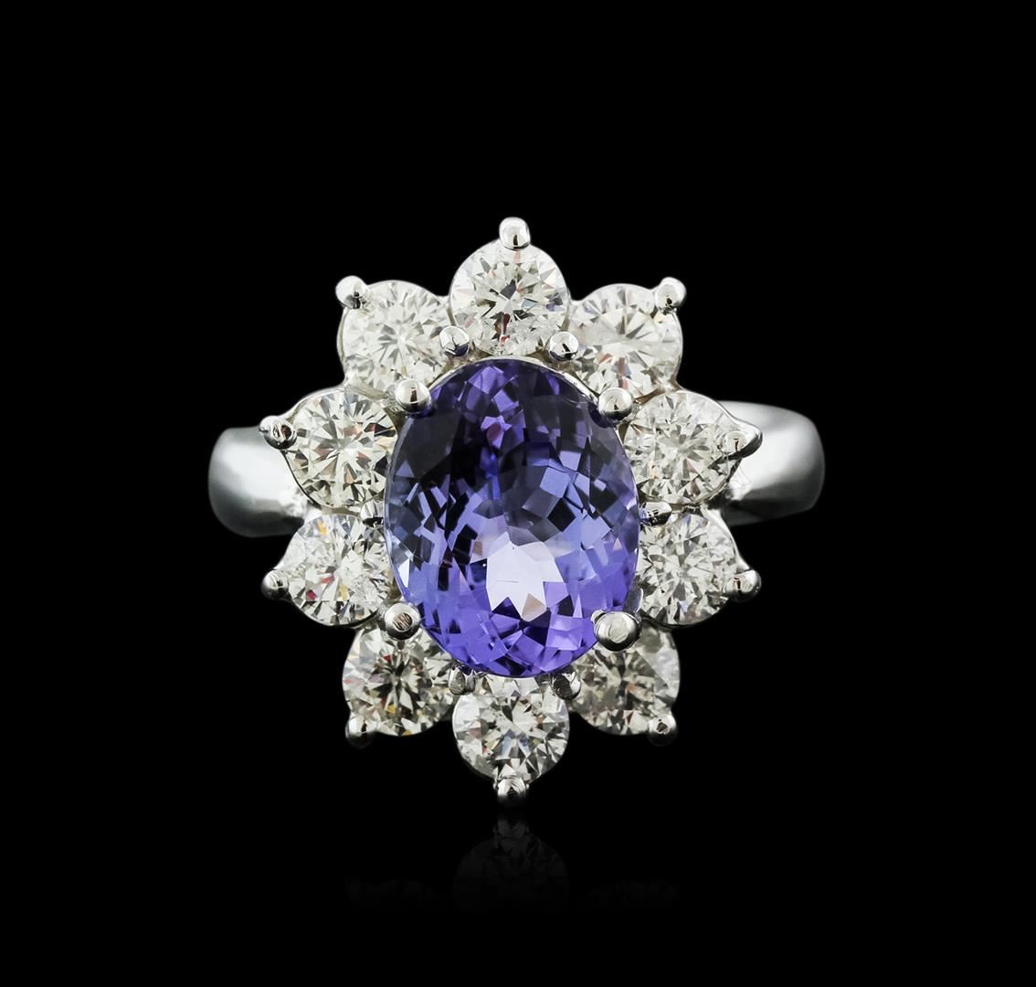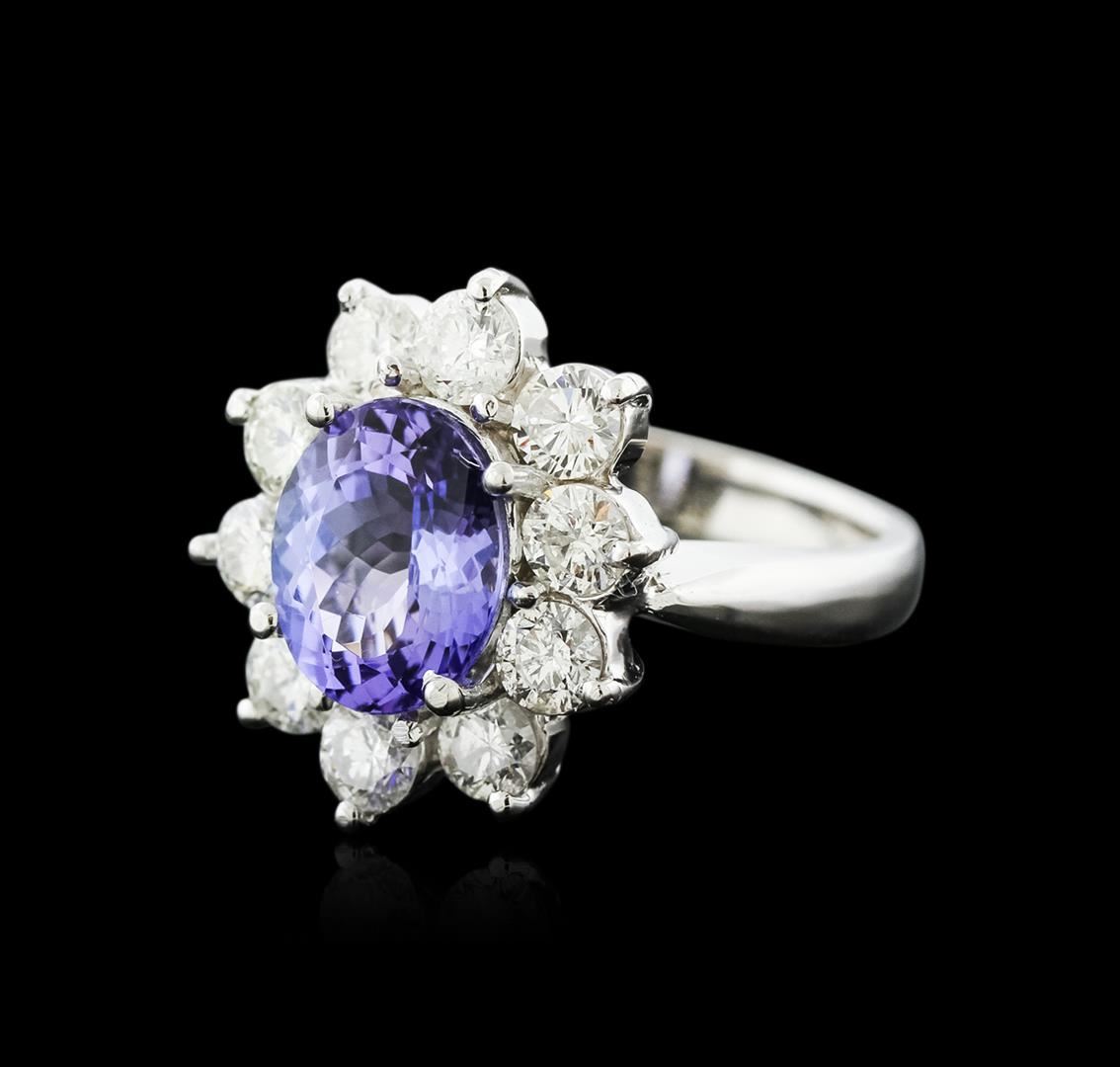 One electronically tested 14KT white gold ladies cast tanzanite and diamond ring with a bright polish finish. Identified with markings of "K14". Condition is new. Containing: One prong set oval modified brilliant cut natural tanzanite, measuring 10.00 x 7.90 x 5.04mm, approximate weight of 2.80ct., clarity is eye clean, type I, medium light, very slightly grayish, violet color, (GIA V 4/3), cut is good. Ten prong set round brilliant cut diamonds, measuring 3.50 - 3.50 x 2.10mm (depth est.) approximate total weight of 10 Stones = 1.57ct. Clarity: SI-2 to I-2. Color: H - I, Cut is Good. Colored gemstones are presumed to have been subjected to commonly used enhancement processes. All diamonds and colored gemstones are graded in the mounting, unless otherwise stated. Total Weight of Colored Stones 2.80ct. Total Weight of Diamonds 1.57ct. Total Weight of Ring 7.60 grams. GGL Appraised at $6,465.00.