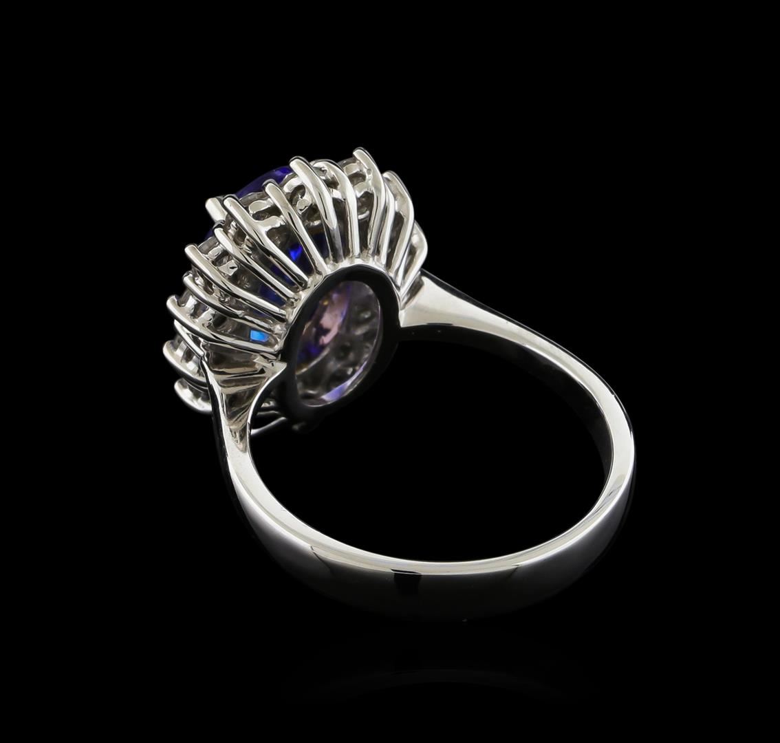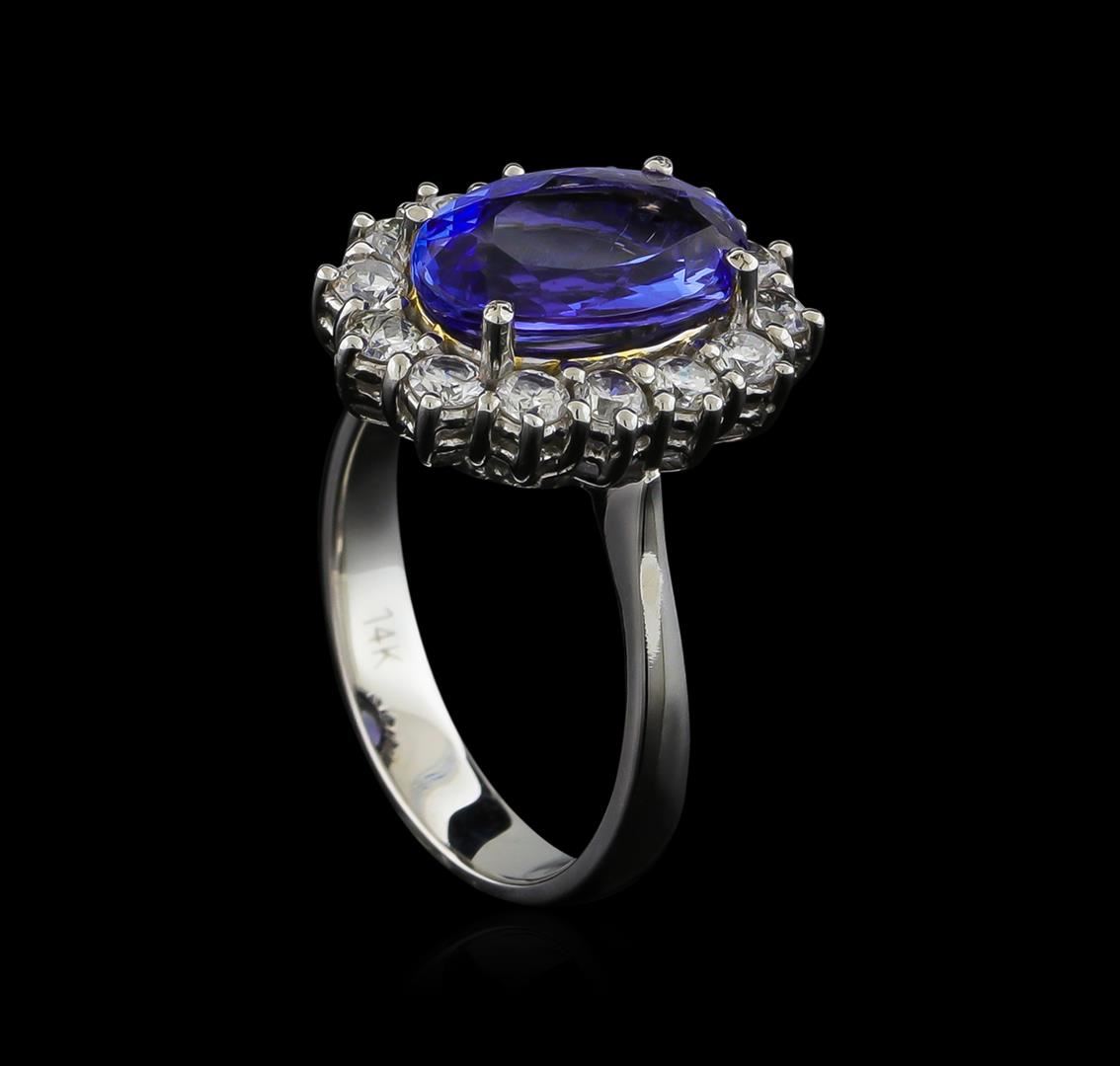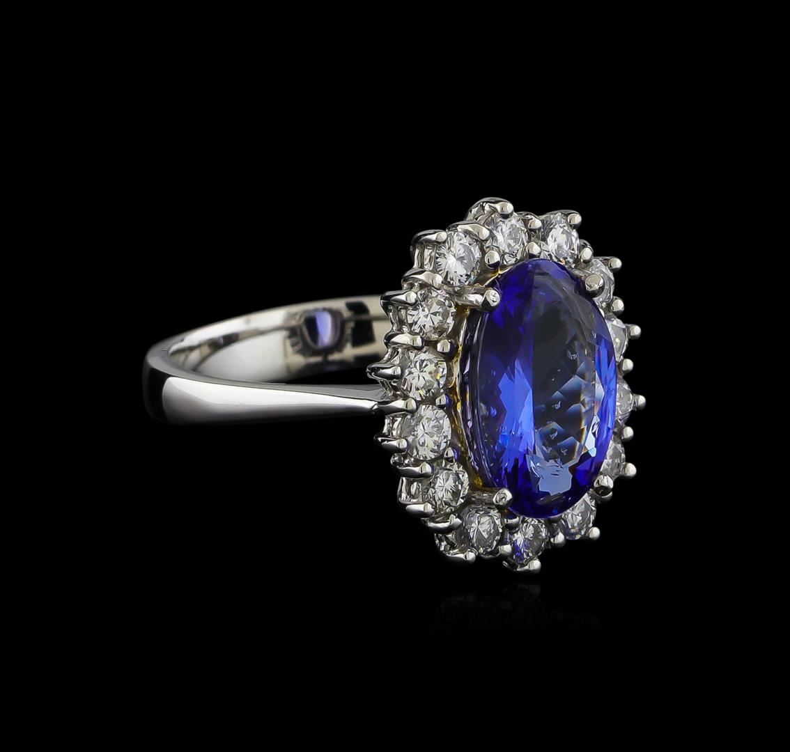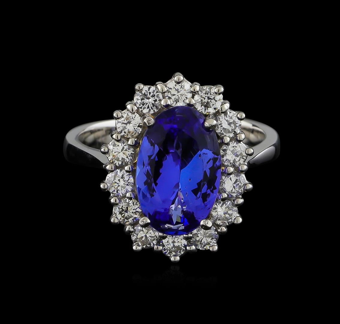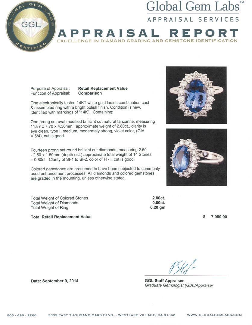 One electronically tested 14KT white gold ladies combination cast & assembled ring with a bright polish finish. Condition is new. Identified with markings of "14K". Containing: One prong set oval modified brilliant cut natural tanzanite, measuring 11.87 x 7.70 x 4.36mm, approximate weight of 2.80ct., clarity is eye clean, type I, medium, moderately strong, ciolet color, (GIA V 5/4), cut is good. Fourteen prong set round brilliant cut diamonds, measuring 2.50 - 2.50 x 1.50mm (depth est.) approximate total weight of 14 Stones = 0.80ct. Clarity of SI-1 to SI-2, color of H - I, cut is good. Colored gemstones are presumed to have been subjected to commonly used enhancement processes. All diamonds and colored gemstones are graded in the mounting, unless otherwise stated. Total Weight of Colored Stones 2.80ct. Total Weight of Diamonds 0.80ct. Total Weight of Ring 6.20 grams. GGL appraised at $7,980.00. GGL Appraised at $7,980.00.