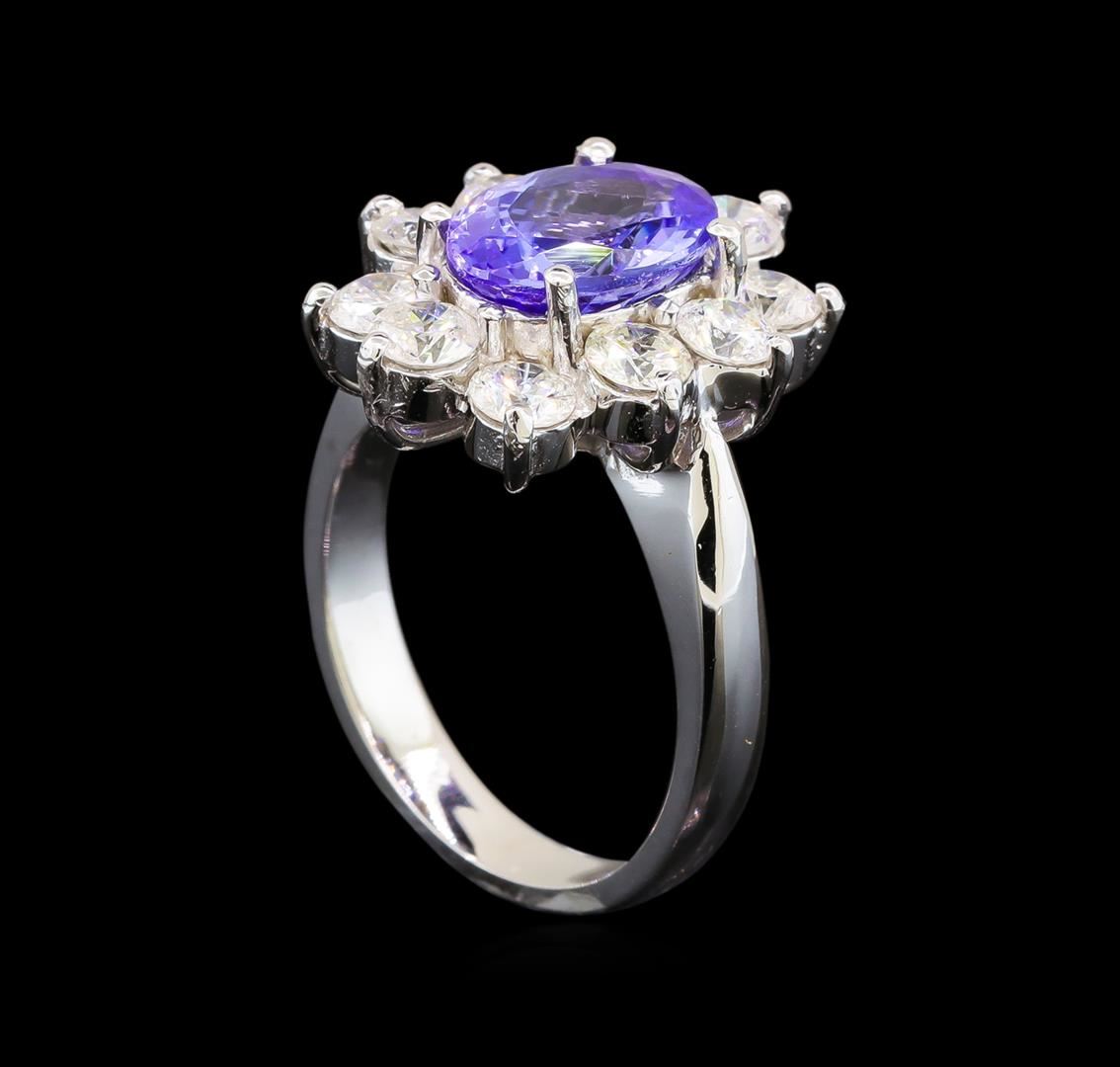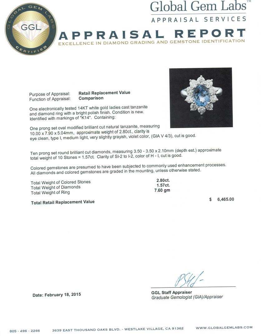 One electronically tested 14KT white gold ladies cast tanzanite and diamond ring with a bright polish finish. Identified with markings of "K14". Condition is new. Containing: One prong set oval modified brilliant cut natural tanzanite, measuring 10.00 x 7.90 x 5.04mm, approximate weight of 2.80ct., clarity is eye clean, type I, medium light, very slightly grayish, violet color, (GIA V 4/3), cut is good. Ten prong set round brilliant cut diamonds, measuring 3.50 - 3.50 x 2.10mm (depth est.) approximate total weight of 10 Stones = 1.57ct. Clarity: SI-2 to I-2. Color: H - I, Cut is Good. Colored gemstones are presumed to have been subjected to commonly used enhancement processes. All diamonds and colored gemstones are graded in the mounting, unless otherwise stated. Total Weight of Colored Stones 2.80ct. Total Weight of Diamonds 1.57ct. Total Weight of Ring 7.60 grams. GGL Appraised at $6,465.00.