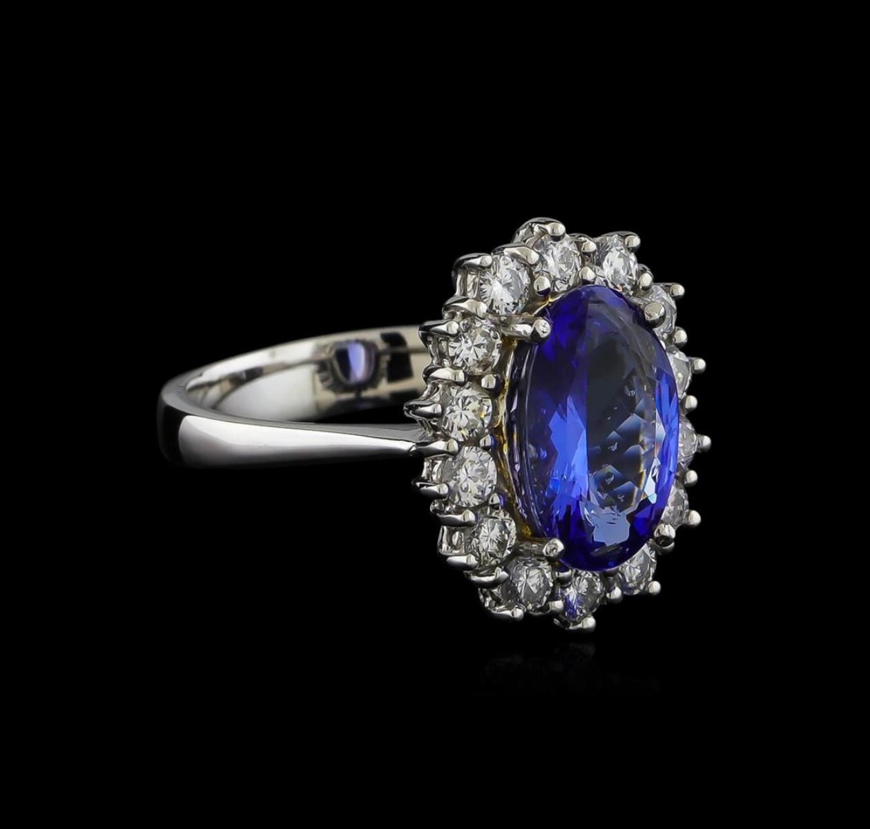 One electronically tested 14KT white gold ladies combination cast & assembled ring with a bright polish finish. Condition is new. Identified with markings of "14K". Containing: One prong set oval modified brilliant cut natural tanzanite, measuring 11.87 x 7.70 x 4.36mm, approximate weight of 2.80ct., clarity is eye clean, type I, medium, moderately strong, ciolet color, (GIA V 5/4), cut is good. Fourteen prong set round brilliant cut diamonds, measuring 2.50 - 2.50 x 1.50mm (depth est.) approximate total weight of 14 Stones = 0.80ct. Clarity of SI-1 to SI-2, color of H - I, cut is good. Colored gemstones are presumed to have been subjected to commonly used enhancement processes. All diamonds and colored gemstones are graded in the mounting, unless otherwise stated. Total Weight of Colored Stones 2.80ct. Total Weight of Diamonds 0.80ct. Total Weight of Ring 6.20 grams. GGL appraised at $7,980.00. GGL Appraised.