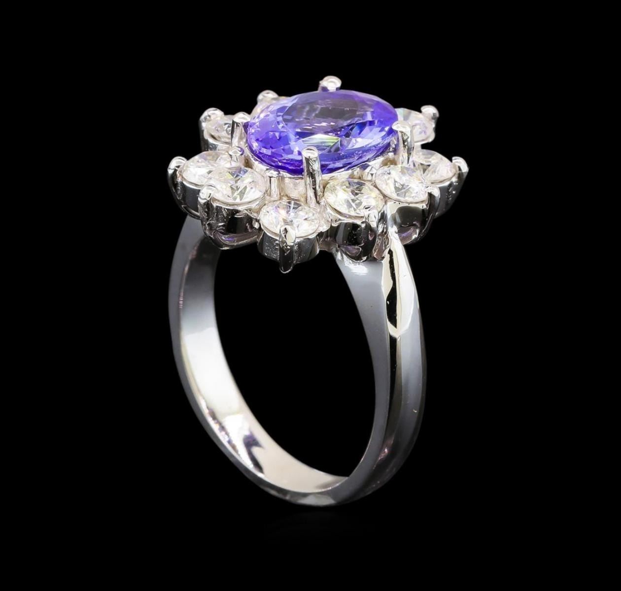 One electronically tested 14KT white gold ladies cast tanzanite and diamond ring with a bright polish finish. Identified with markings of "K14". Condition is new. Containing: One prong set oval modified brilliant cut natural tanzanite, measuring 10.00 x 7.90 x 5.04mm, approximate weight of 2.80 ct., clarity is eye clean, type I, medium light, very slightly grayish, violet color, (GIA V 4/3), cut is good. Ten prong set round brilliant cut diamonds, measuring 3.50 - 3.50 x 2.10mm (depth est.) approximate total weight of 10 Stones = 1.57ct. Clarity: SI-2 to I-2. Color: H - I, Cut is Good. Colored gemstones are presumed to have been subjected to commonly used enhancement processes. All diamonds and colored gemstones are graded in the mounting, unless otherwise stated. Total Weight of Colored Stones 2.80 ct. Total Weight of Diamonds 1.57ct. Total Weight of Ring 7.60 grams. GGL Appraised.