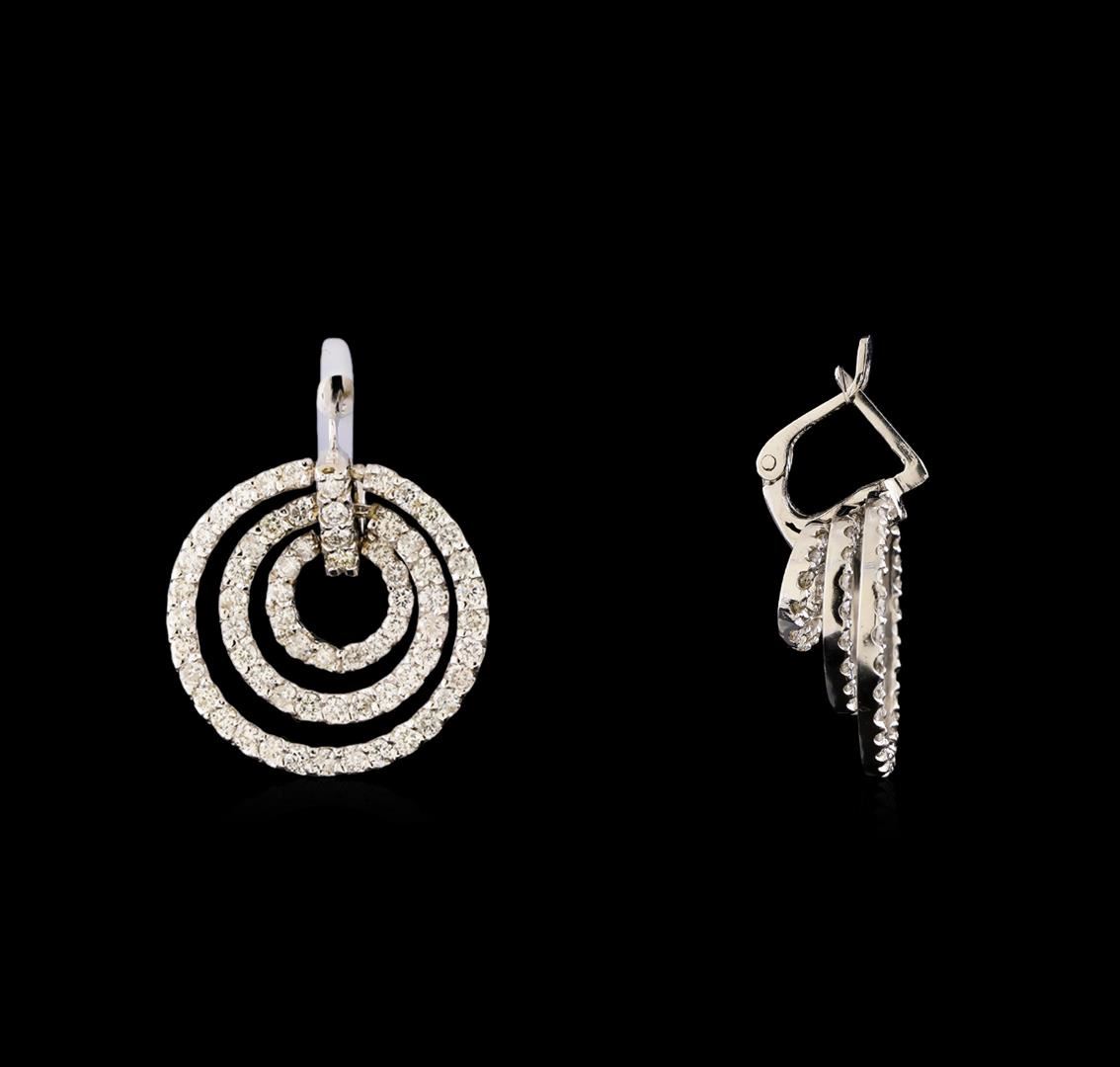 One pair electronically tested 14KT white gold ladies combination cast & assembled diamond earrings with hinged clip backs with a bright polish finish. Identified with markings of "14K". Condition is new. Containing: One Hundred Thirty-Two prong set round brilliant cut diamonds, measuring 1.80 - 1.80 x 1.08mm (depth est.) approximate total weight of 132 Stones = 2.81ct. Clarity: I-1 to I-2. Color: I - J, Cut is Good. All diamonds are graded in the mounting, unless otherwise stated. Total Weight of Diamonds 2.81ct. Total Weight of Earrings 9.70 grams. GGL Appraised at $7,100.00.