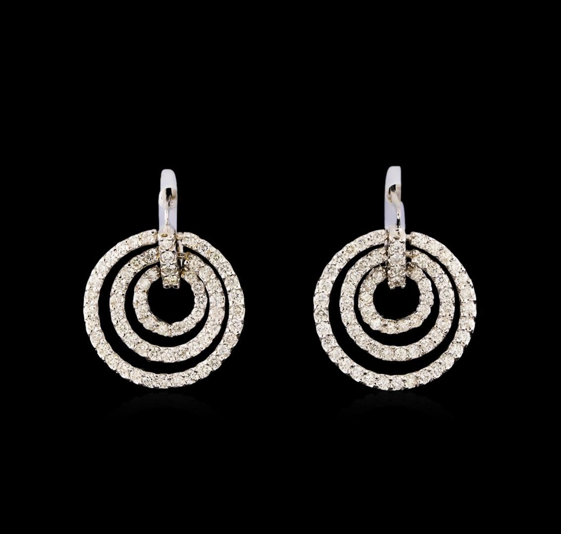 One pair electronically tested 14KT white gold ladies combination cast & assembled diamond earrings with hinged clip backs with a bright polish finish. Identified with markings of "14K". Condition is new. Containing: One Hundred Thirty-Two prong set round brilliant cut diamonds, measuring 1.80 - 1.80 x 1.08mm (depth est.) approximate total weight of 132 Stones = 2.81ct. Clarity: I-1 to I-2. Color: I - J, Cut is Good. All diamonds are graded in the mounting, unless otherwise stated. Total Weight of Diamonds 2.81ct. Total Weight of Earrings 9.70 grams. GGL Appraised at $7,100.00.