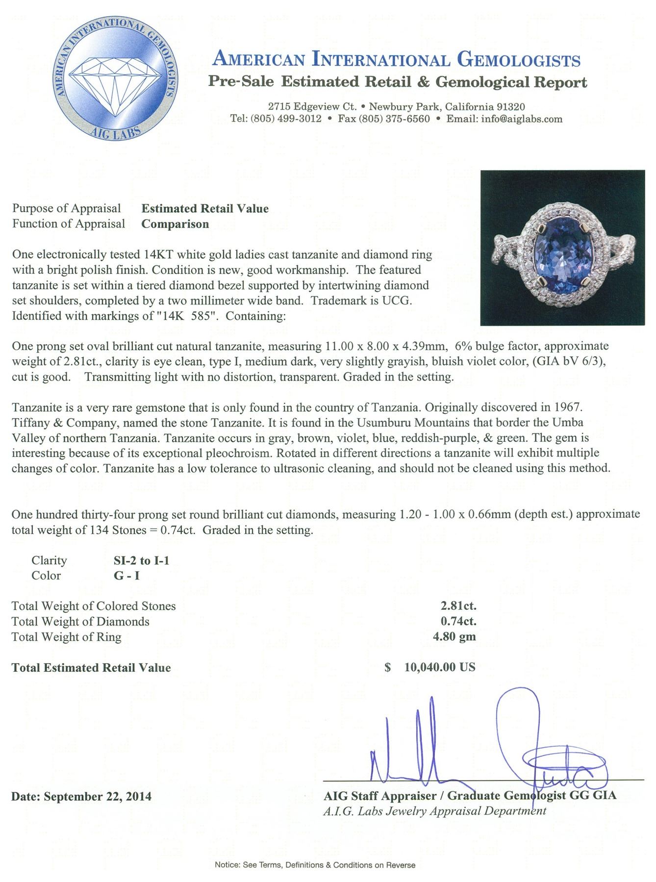One electronically tested 14KT white gold ladies cast tanzanite and diamond ring with a bright polish finish. The featured tanzanite is set within a tiered diamond bezel supported by intertwining diamond set shoulders, completed by a two millimeter wide band. Trademark is UCG. Identified with markings of "14K 585". Condition is new, good workmanship. Containing: One prong set oval brilliant cut natural tanzanite, measuring 11.00 x 8.00 x 4.39mm, 6% bulge factor, approximate weight of 2.81ct., clarity is eye clean, type I, medium dark, very slightly grayish, bluish violet color, (GIA bV 6/3), cut is good. Transmitting light with no distortion, transparent. Graded in the setting. Tanzanite is a very rare gemstone that is only found in the country of Tanzania. Originally discovered in 1967. Tiffany & Company, named the stone Tanzanite. It is found in the Usumburu Mountains that border the Umba Valley of northern Tanzania. Tanzanite occurs in gray, brown, violet, blue, reddish-purple, & green. The gem is interesting because of its exceptional pleochroism. Rotated in different directions a tanzanite will exhibit multiple changes of color. Tanzanite has a low tolerance to ultrasonic cleaning, and should not be cleaned using this method. One Hundred Thirty-Four prong set round brilliant cut diamonds, measuring 1.20 - 1.00 x 0.66mm (depth est.) approximate total weight of 134 Stones = 0.74ct. Graded in the setting. Clarity: SI-2 to I-1. Color: G - I. Total Weight of Colored Stones 2.81ct. Total Weight of Diamonds 0.74ct. Total Weight of Ring 4.80 grams. AIG Appraised.