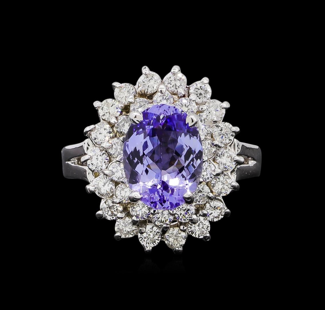 One electronically tested 14KT white gold ladies cast tanzanite and diamond ring with a bright polish finish. Identified with markings of "14K". Condition is new. Containing: One prong set oval modified brilliant cut natural tanzanite, measuring 9.50 x 7.30 x 5.78mm, approximate weight of 2.82ct., clarity is eye clean, type I, medium light, very slightly grayish, violet color, (GIA V 4/3), cut is good. Thirty-Two prong set round brilliant cut diamonds, measuring 1.80 - 1.50 x 0.99mm (depth est.) approximate total weight of 32 Stones = 0.53ct. Clarity: SI-1 to I-1. Color: I - J, Cut is Good. Colored gemstones are presumed to have been subjected to commonly used enhancement processes. All diamonds and colored gemstones are graded in the mounting, unless otherwise stated. Total Weight of Colored Stones 2.82ct. Total Weight of Diamonds 0.53ct. Total Weight of Ring 5.80 grams. GGL Appraised at $3,835.00.