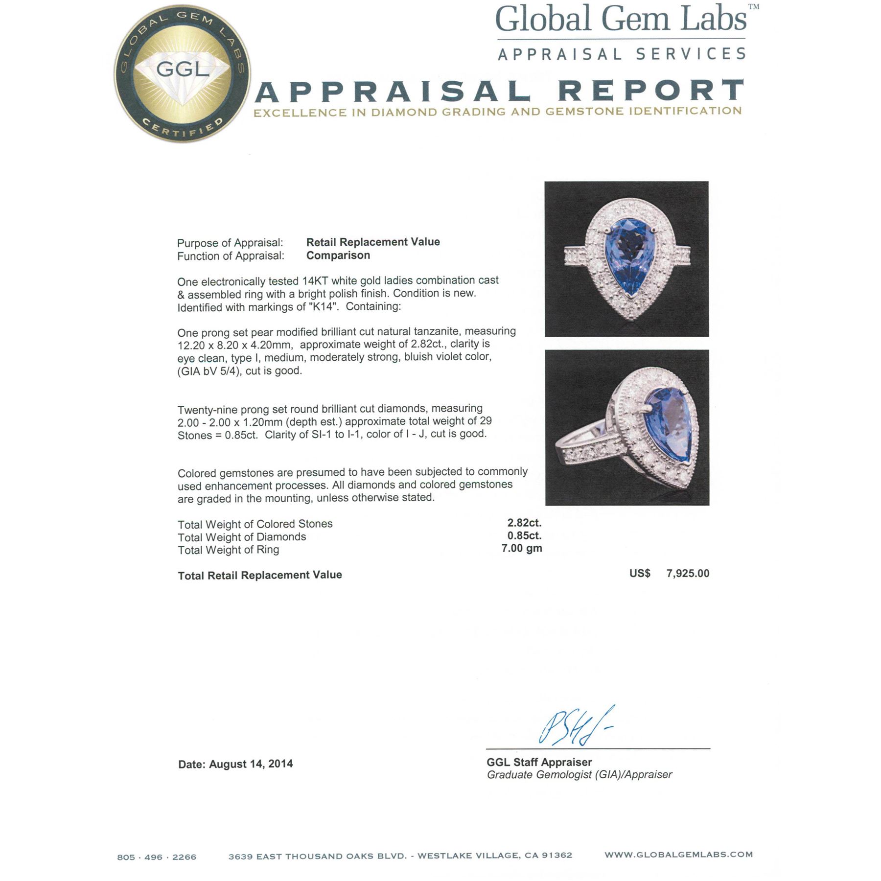 One electronically tested 14KT white gold ladies combination cast & assembled ring with a bright polish finish. Condition is new. Identified with markings of "K14". Containing: One prong set pear modified brilliant cut natural tanzanite, measuring 12.20 x 8.20 x 4.20mm, approximate weight of 2.82ct., clarity is eye clean, type I, medium, moderately strong, bluish violet color, (GIA bV 5/4), cut is good. Twenty-Nine prong set round brilliant cut diamonds, measuring 2.00 - 2.00 x 1.20mm (depth est.) approximate total weight of 29 Stones = 0.85ct. Clarity: SI-1 to I-1. Color: I - J, Cut is Good. Colored gemstones are presumed to have been subjected to commonly used enhancement processes. All diamonds and colored gemstones are graded in the mounting, unless otherwise stated. Total Weight of Colored Stones 2.82ct. Total Weight of Diamonds 0.85ct. Total Weight of Ring 7.00 grams. GGL Appraised at $7,925.00.