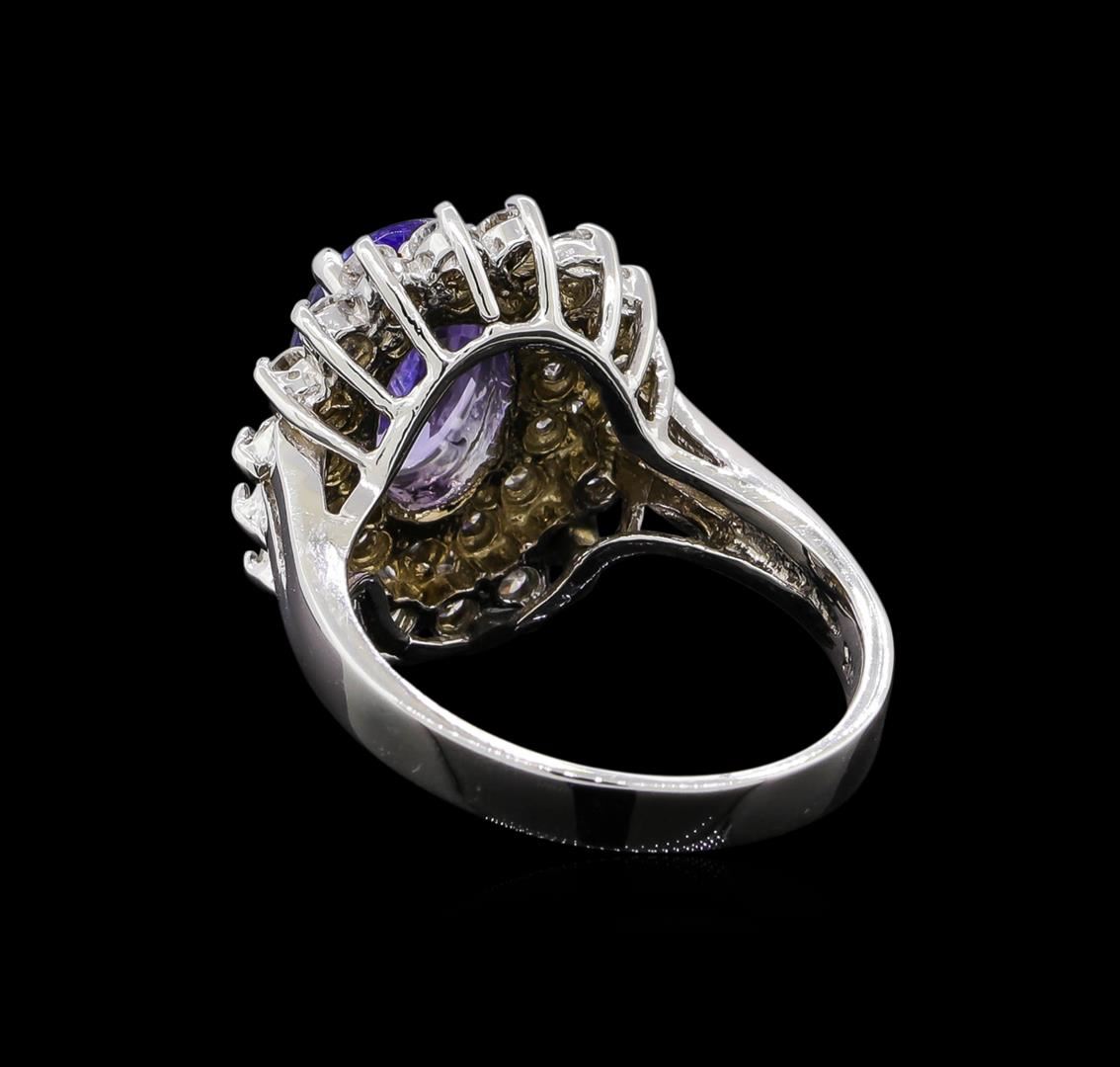 One electronically tested 14KT white gold ladies cast tanzanite and diamond ring with a bright polish finish. Identified with markings of "14K". Condition is new. Containing: One prong set oval modified brilliant cut natural tanzanite, measuring 9.50 x 7.30 x 5.78mm, approximate weight of 2.82ct., clarity is eye clean, type I, medium light, very slightly grayish, violet color, (GIA V 4/3), cut is good. Thirty-Two prong set round brilliant cut diamonds, measuring 1.80 - 1.50 x 0.99mm (depth est.) approximate total weight of 32 Stones = 0.53ct. Clarity: SI-1 to I-1. Color: I - J, Cut is Good. Colored gemstones are presumed to have been subjected to commonly used enhancement processes. All diamonds and colored gemstones are graded in the mounting, unless otherwise stated. Total Weight of Colored Stones 2.82ct. Total Weight of Diamonds 0.53ct. Total Weight of Ring 5.80 grams. GGL Appraised at $3,835.00.