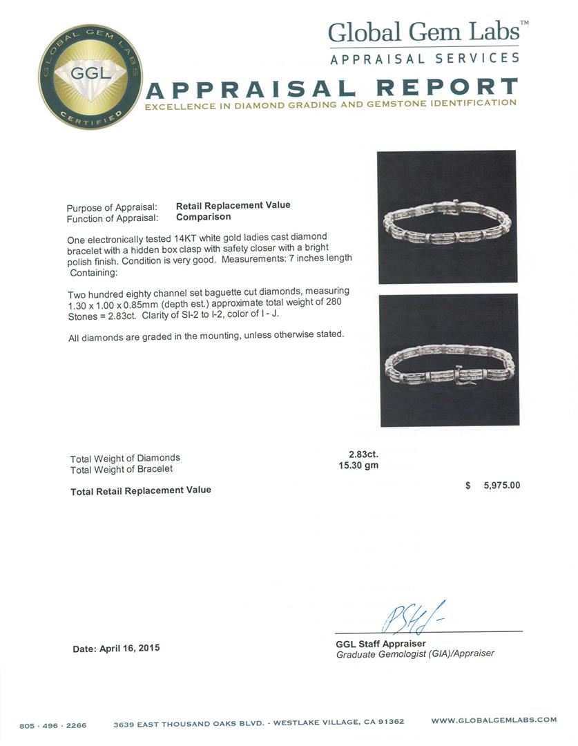 One electronically tested 14KT white gold ladies cast diamond bracelet with a hidden box clasp with safety closer with a bright polish finish. Measurements: 7 inches length Condition is very good. Containing: Two Hundred Eighty channel set baguette cut diamonds, measuring 1.30 x 1.00 x 0.85mm (depth est.) approximate total weight of 280 Stones = 2.83ct. Clarity: SI-2 to I-2. Color: I - J. All diamonds are graded in the mounting, unless otherwise stated. Total Weight of Diamonds 2.83ct. Total Weight of Bracelet 15.30 grams. GGL Appraised.