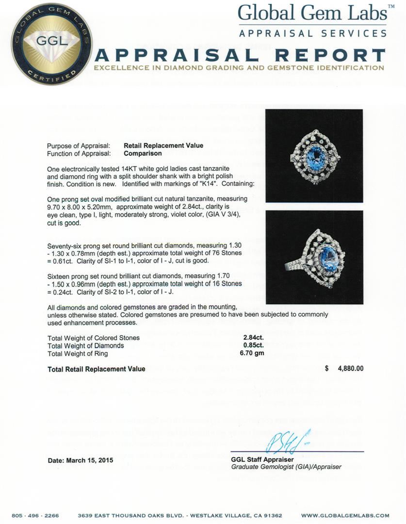 One electronically tested 14KT white gold ladies cast tanzanite and diamond ring with a split shoulder shank with a bright polish finish. Identified with markings of "K14". Condition is new. Containing: One prong set oval modified brilliant cut natural tanzanite, measuring 9.70 x 8.00 x 5.20mm, approximate weight of 2.84ct., clarity is eye clean, type I, light, moderately strong, violet color, (GIA V 3/4), cut is good. Seventy-Six prong set round brilliant cut diamonds, measuring 1.30 - 1.30 x 0.78mm (depth est.) approximate total weight of 76 Stones = 0.61ct. Clarity of SI-1 to I-1, Color of I - J, Cut is Good. Sixteen prong set round brilliant cut diamonds, measuring 1.70 - 1.50 x 0.96mm (depth est.) approximate total weight of 16 Stones = 0.24ct. Clarity of SI-2 to I-1, Color of I - J. All diamonds and colored gemstones are graded in the mounting, unless otherwise stated. Colored gemstones are presumed to have been subjected to commonly used enhancement processes. Total Weight of Colored Stones 2.84ct. Total Weight of Diamonds 0.85ct. Total Weight of Ring 6.70 grams. GGL Appraised at $4,880.00.