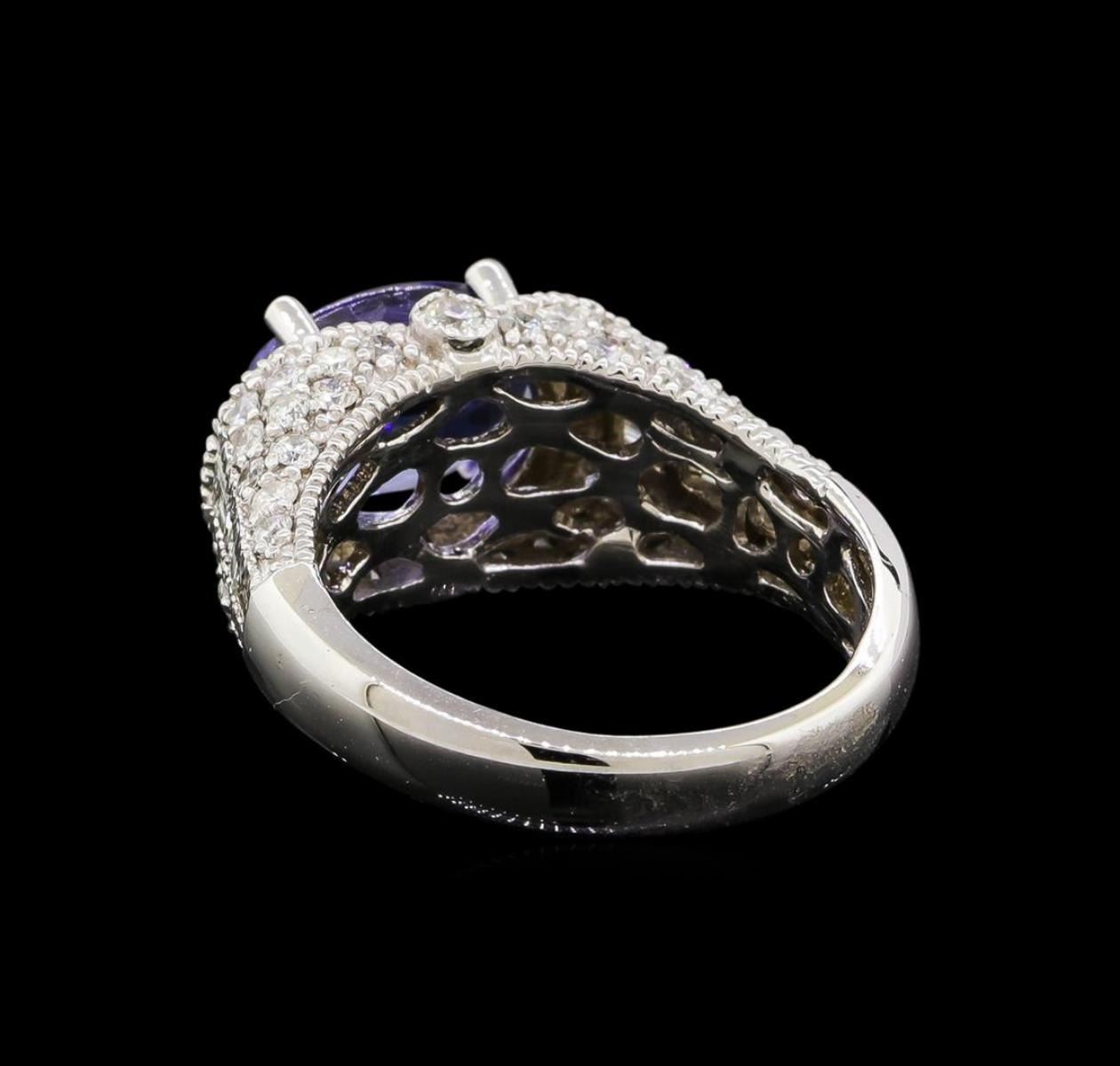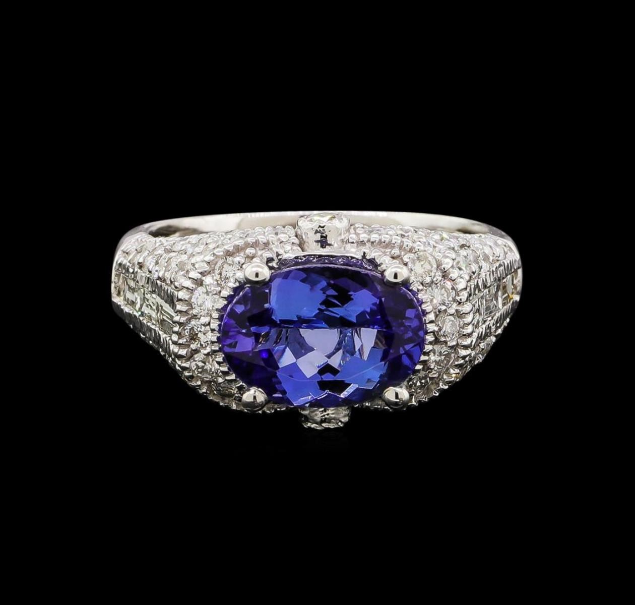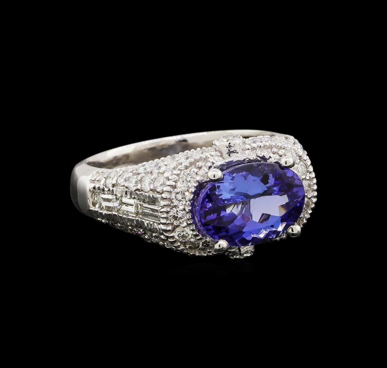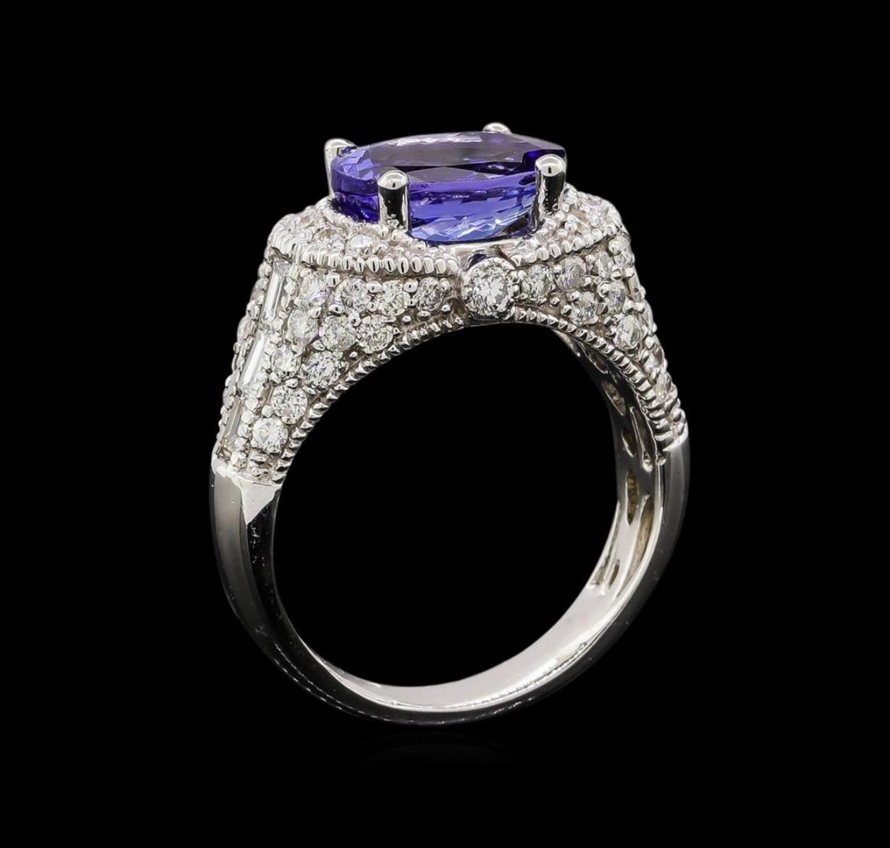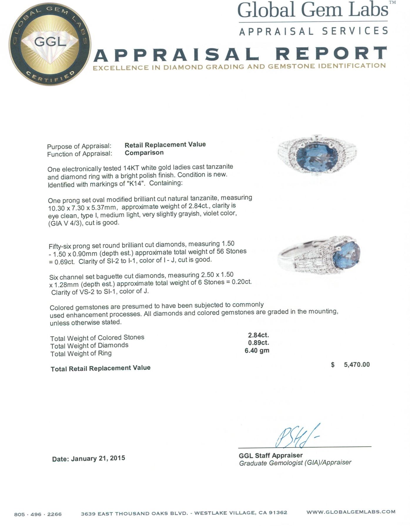 One electronically tested 14KT white gold ladies cast tanzanite and diamond ring with a bright polish finish. Identified with markings of "K14". Condition is new. Containing: One prong set oval modified brilliant cut natural tanzanite, measuring 10.30 x 7.30 x 5.37mm, approximate weight of 2.84ct., clarity is eye clean, type I, medium light, very slightly grayish, violet color, (GIA V 4/3), cut is good. Fifty-Six prong set round brilliant cut diamonds, measuring 1.50 - 1.50 x 0.90mm (depth est.) approximate total weight of 56 Stones = 0.69ct. Clarity: SI-2 to I-1. Color: I - J, Cut is Good. Six channel set baguette cut diamonds, measuring 2.50 x 1.50 x 1.28mm (depth est.) approximate total weight of 6 Stones = 0.20 ct. Clarity: VS-2 to SI-1. Color: J. Colored gemstones are presumed to have been subjected to commonly used enhancement processes. All diamonds and colored gemstones are graded in the mounting, unless otherwise stated. Total Weight of Colored Stones 2.84ct. Total Weight of Diamonds 0.89ct. Total Weight of Ring 6.40 grams. GGL Appraised.