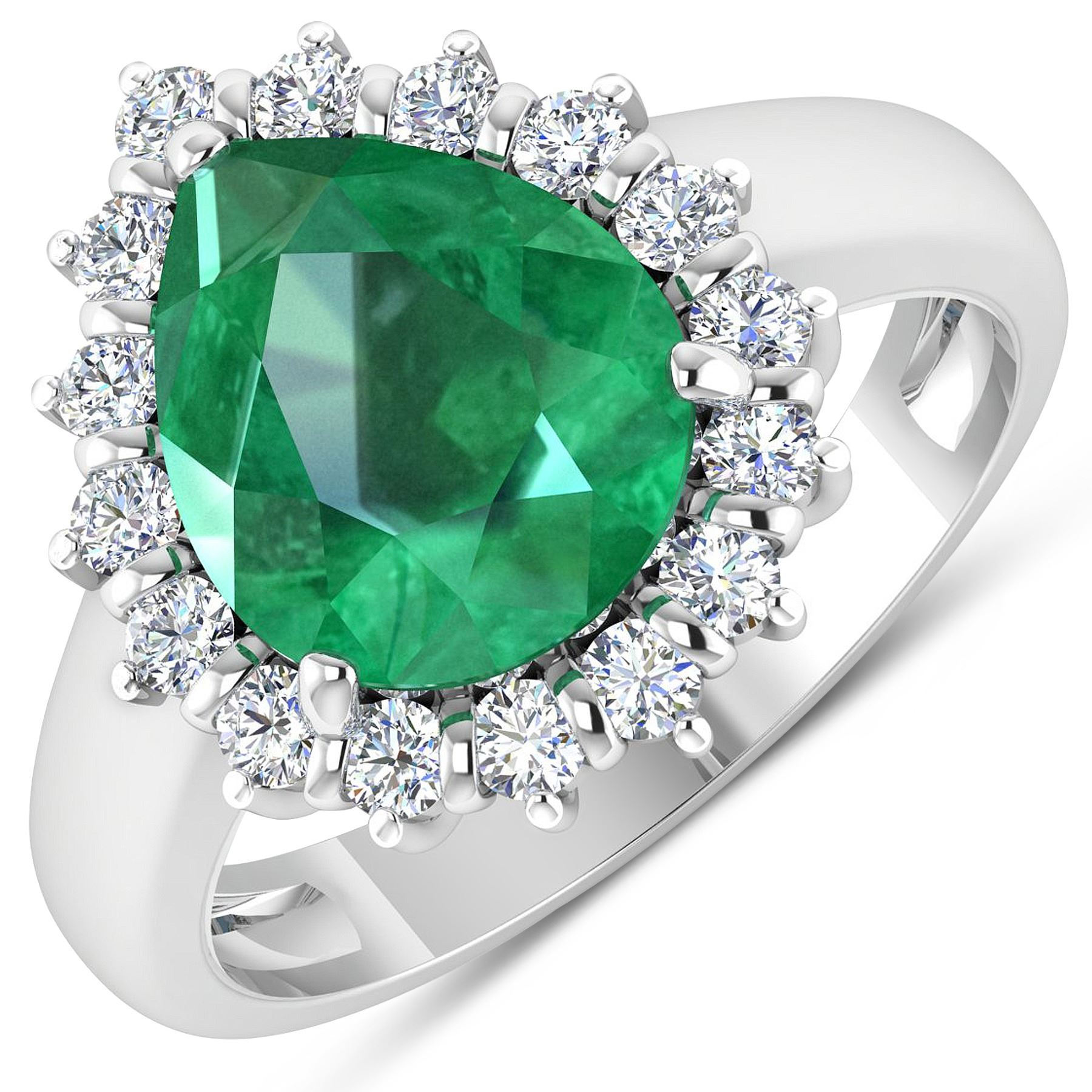 Zambian Emerald (AA) Pears 11x9mm - 1Pc + White Diamond F/C Round 2.00mm - 16Pcs ( Diamond Quality : SI-2/HI ). Total weight of gemstone is 2.85cts. Total weight of Diamonds is 0.48cts. Total weight of this ring is 4.41 grams. Ring size 7.