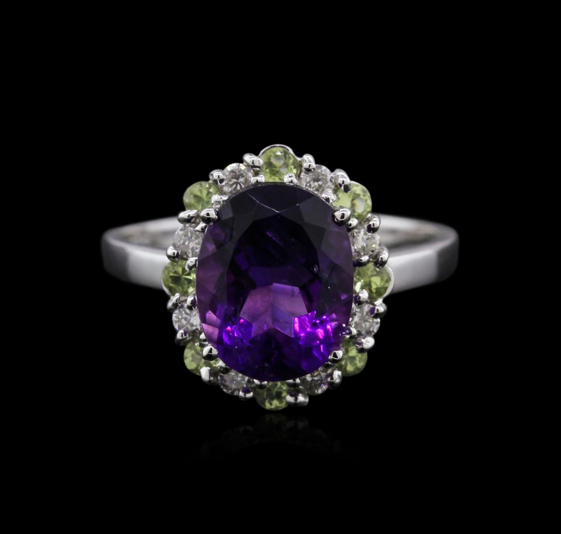 One ring featuring: 14KT white gold weighing 3.28 grams containing one amethyst center stone with a total weight of 2.86ct, eight peridots with a total weight of 0.32ct, and diamonds with a total weight of 0.20ct.