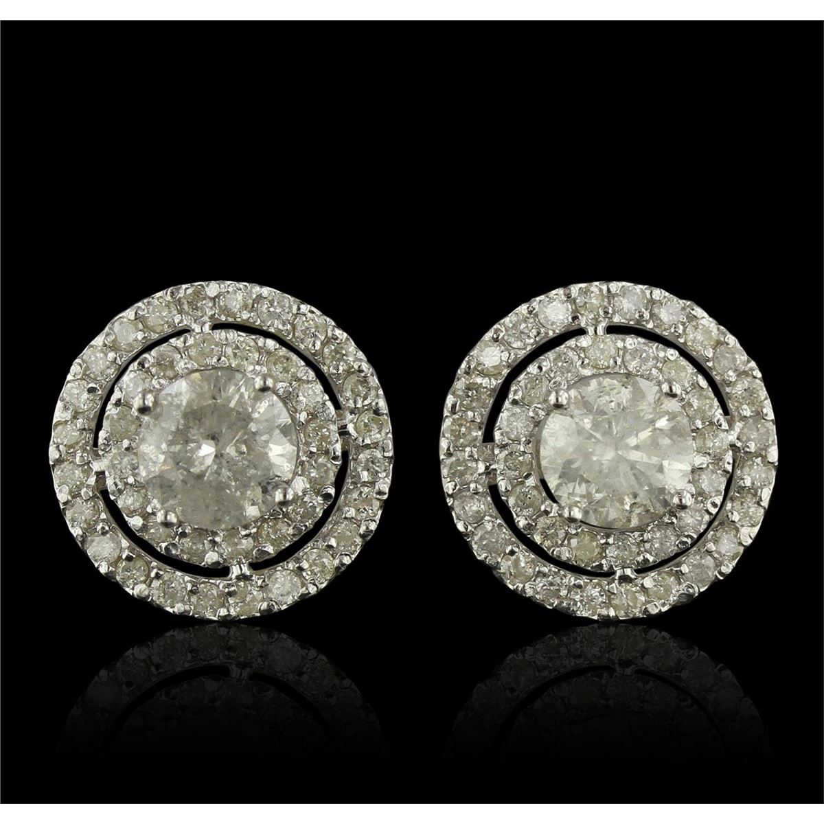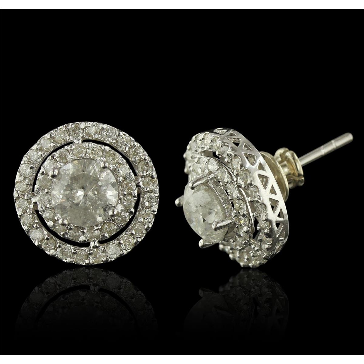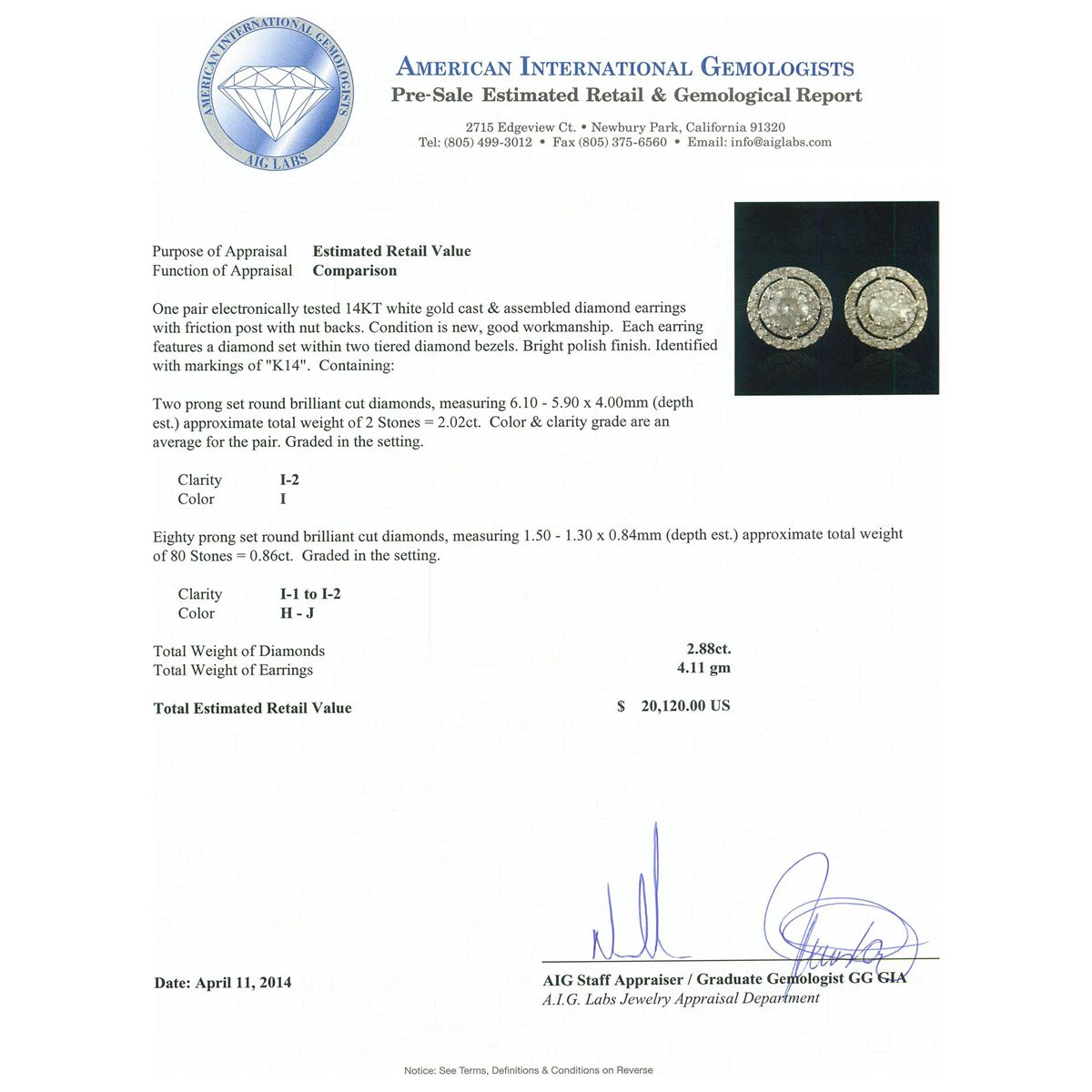 One pair electronically tested 14KT white gold cast & assembled diamond earrings with friction post with nut backs. Condition is new, good workmanship. Each earring features a diamond set within two tiered diamond bezels. Bright polish finish. Identified with markings of "K14". Containing: Two prong set round brilliant cut diamonds, measuring 6.10 - 5.90 x 4.00mm (depth est.) approximate. Total Weight of 2 Stones = 2.02ct. Color & clarity grade are an average for the pair. Graded in the setting. Clarity: I-2. Color: I Eighty prong set round brilliant cut diamonds, measuring 1.50 - 1.30 x 0.84mm (depth est.) approximate. Total Weight of 80 Stones = 0.86ct. Graded in the setting. Clarity: I-1 to I-2. Color: H - J. Total Weight of Diamonds 2.88ct. Total Weight of Earrings 4.11 grams. AIG Appraised at $20,120.00.