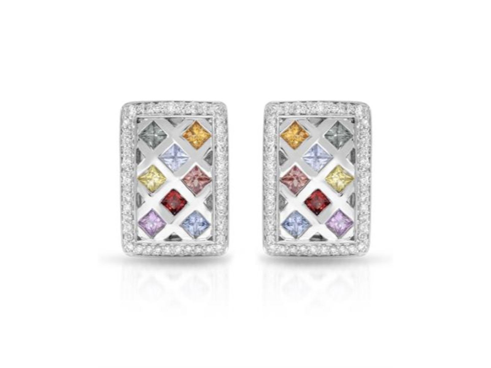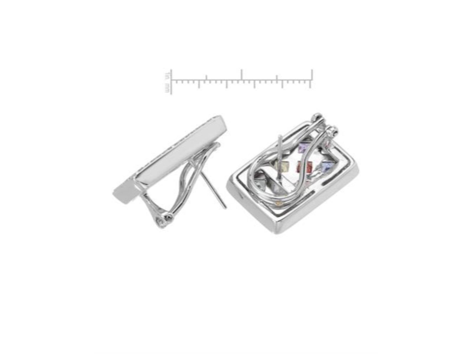 14KT White Gold 2.88ctw Multi Color Sapphire and Diamond Earrings. (16) Multi color sapphires with a total weight of 2.88cts. (92) Round Diamonds with a total weight of 0.85cts with a color of I and clarity of I-1. Total weight of these earrings are 13.57 grams.