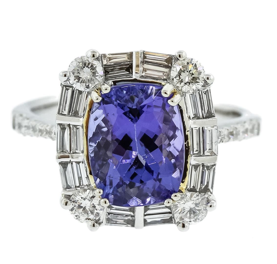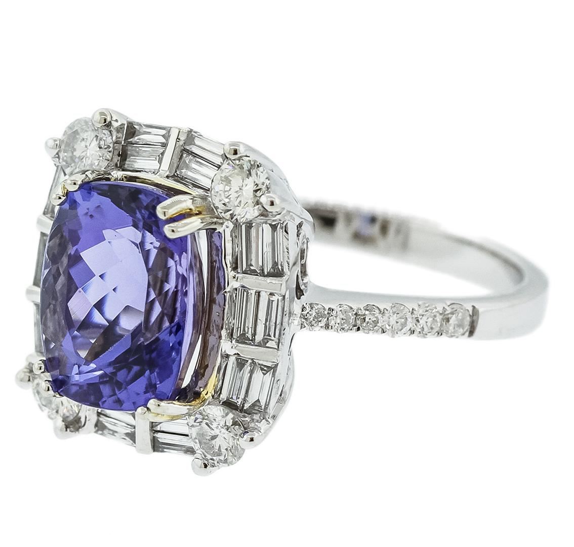 One electronically tested 14KT white gold ladies cast tanzanite and diamond ring with a bright polish finish. Identified with markings of "14K". Condition is new. Containing: One prong set rectangular cushion modified brilliant cut natural tanzanite, measuring 9.80 x 7.60 x 4.95mm, approximate weight of 2.90ct., clarity is eye clean, type I, medium, very slightly grayish, bluish violet color, (GIA bV 5/3), cut is good. Sixteen prong set round brilliant cut diamonds, measuring 2.80 - 1.20 x 1.20mm (depth est.) approximate total weight of 16 Stones = 0.30ct. . Clarity: SI-1 to SI-2. Color: I - J, Cut is Good. Twenty channel set baguette cut diamonds, measuring 2.30 x 1.00 x 0.85mm (depth est.) approximate total weight of 20 Stones = 0.36ct. . Clarity: SI-1. Color: I - J. Colored gemstones are presumed to have been subjected to commonly used enhancement processes. All diamonds and colored gemstones are graded in the mounting, unless otherwise stated.. Total Weight of Colored Stones 2.90ct.. Total Weight of Diamonds 0.66ct.. Total Weight of Ring 5.50 grams. GGL Appraised at $4,590.00.