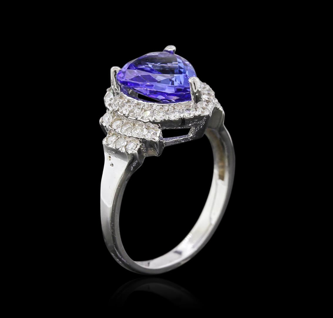 One electronically tested 14KT white gold ladies cast tanzanite and diamond ring with a bright polish finish. Identified with markings of "14K". Condition is new. Containing: One prong set pear modified brilliant cut natural tanzanite, measuring 11.00 x 8.00 x 5.20mm, approximate weight of 2.90ct., clarity is eye clean, type I, medium, moderately strong, bluish violet color, (GIA bV 5/4), cut is good. Thirty-Eight prong set round brilliant cut diamonds, measuring 1.30 - 1.30 x 0.78mm (depth est.) approximate total weight of 38 Stones = 0.47ct. Clarity: SI-1. Color: I - J, Cut is Good. Colored gemstones are presumed to have been subjected to commonly used enhancement processes. All diamonds and colored gemstones are graded in the mounting, unless otherwise stated. Total Weight of Colored Stones 2.90ct. Total Weight of Diamonds 0.47ct. Total Weight of Ring 4.60 grams. GGL Appraised at $3,370.00.