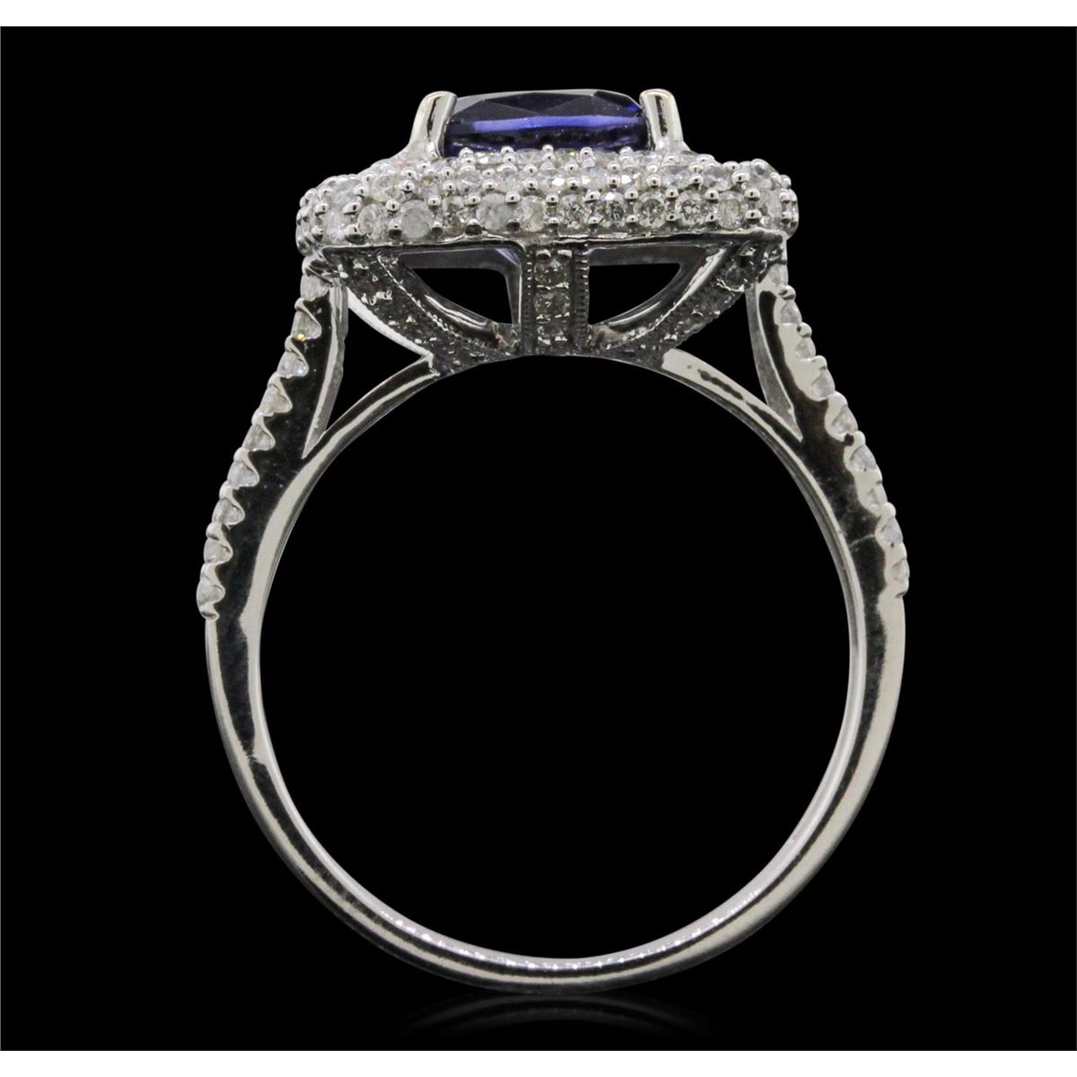 One electronically tested 14KT white gold ladies combination cast & assembled sapphire and diamond ring with a split shank with a bright polish finish. Identified with markings of "14K". Condition is new. Containing: One prong set square cushion modified brilliant cut natural blue sapphire, measuring 7.71 x 7.76 x 5.15mm, approximate weight of 2.90ct., clarity is eye clean, type II, medium dark, moderately strong, blue color, (GIA B 6/4), cut is very good. One Hundred Forty prong set round brilliant cut diamonds, measuring 1.10 - 1.10 x 0.66mm (depth est.) approximate total weight of 140 Stones = 0.67ct. Clarity: I-1 to I-2. Color: I - J, Cut is Good. Colored gemstones are presumed to have been subjected to commonly used enhancement processes. All diamonds and colored gemstones are graded in the mounting, unless otherwise stated. Total Weight of Colored Stones 2.90ct. Total Weight of Diamonds 0.67ct. Total Weight of Ring 5.10 grams. GGL Appraised at $8,080.00.