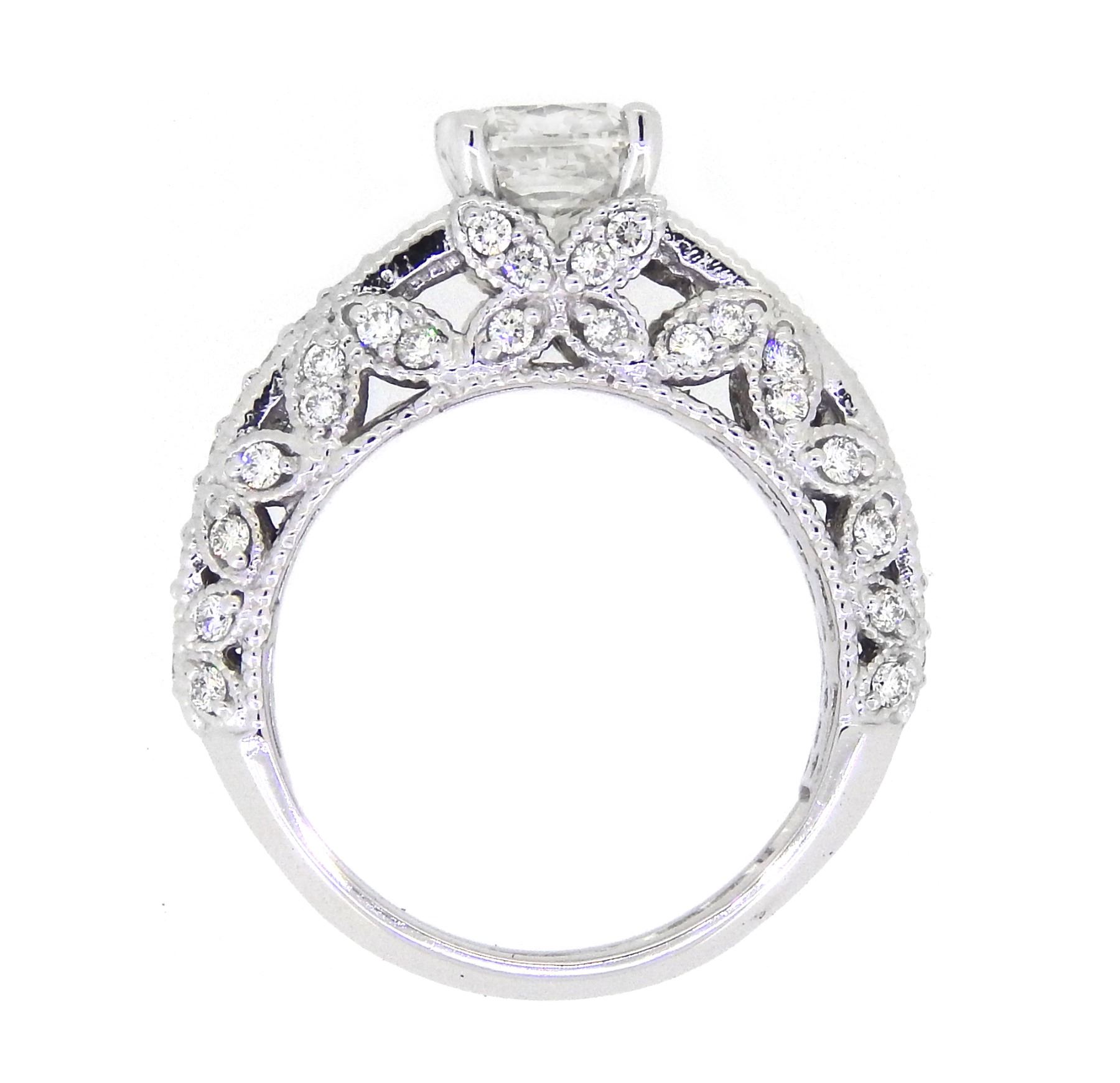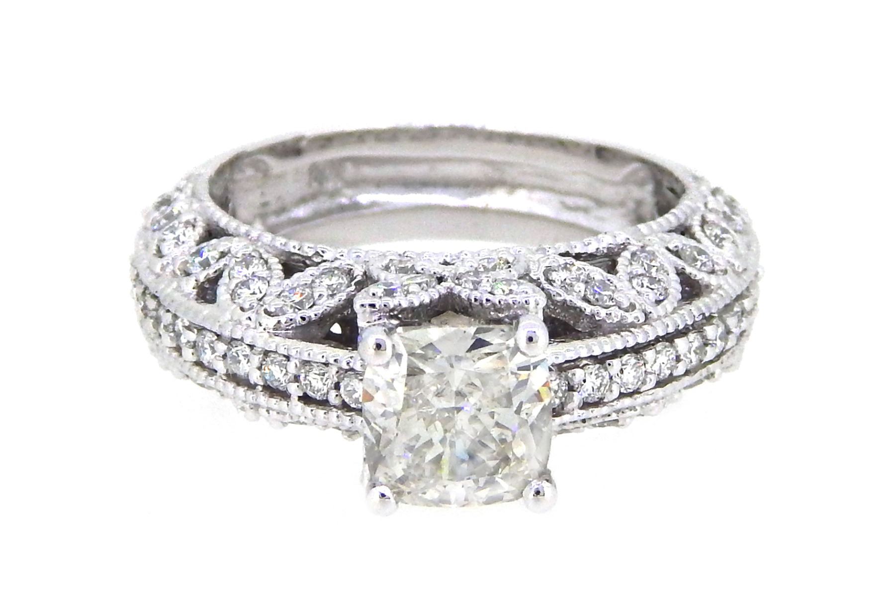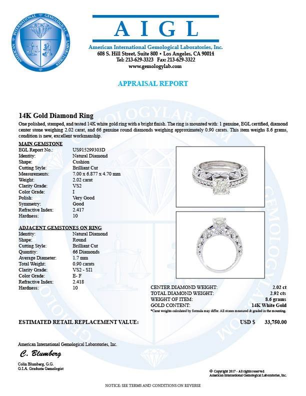 One 14KT White Gold 2.92ctw Diamond Ring. (1) Cushion cut center Diamond with a total weight of 2.02cts with a color of I and clarity of VS-2. (66) Diamonds with a total weight of 0.90cts with a color of E-F and clarity of VS-2 to SI-1. Total weight of this ring is 8.6 grams.