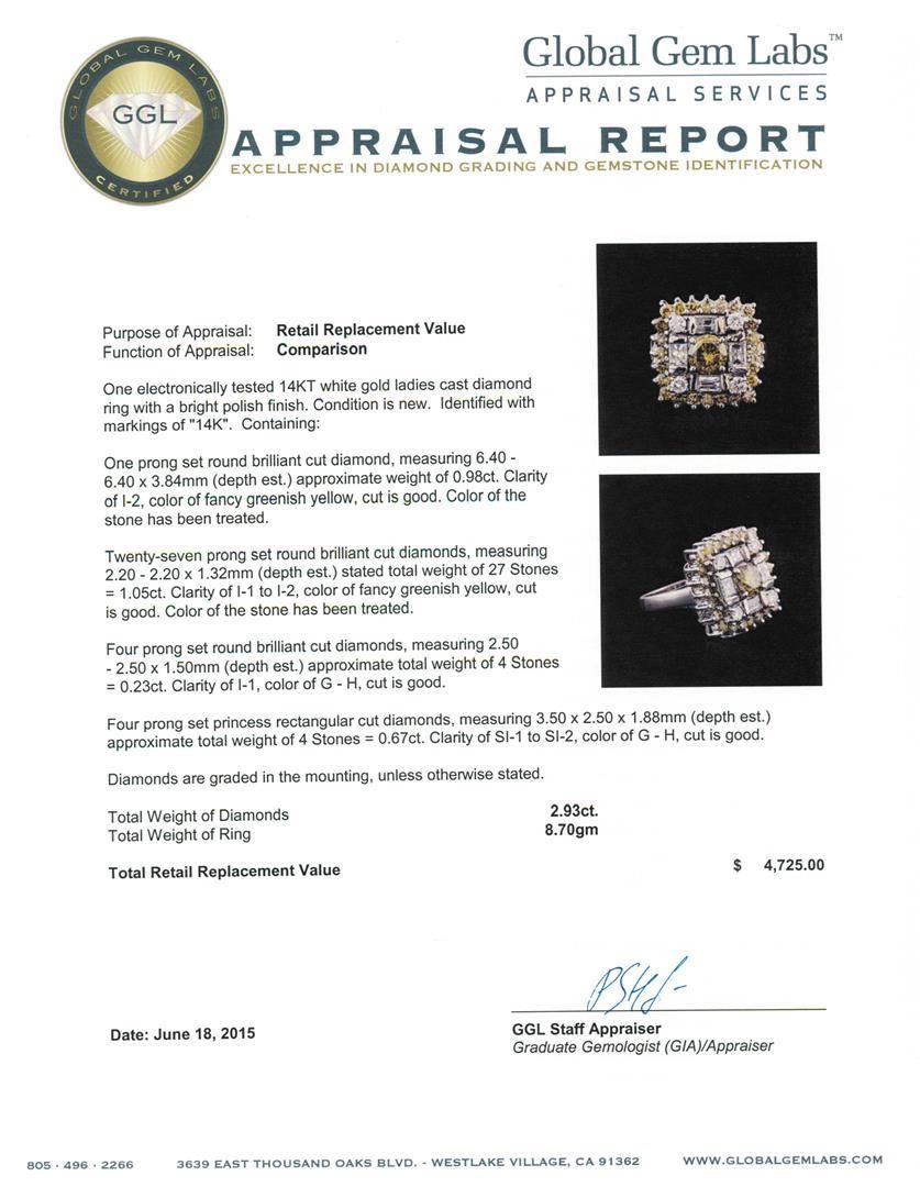 One electronically tested 14KT white gold ladies cast diamond ring with a bright polish finish. Identified with markings of "14K". Condition is new. Containing: One prong set round brilliant cut diamond, measuring 6.40 - 6.40 x 0.00mm (depth est.) approximate weight of 0.00 ct. Clarity: I-2, Cut is Good. Color of the stone has been treated. Twenty-Seven prong set round brilliant cut diamonds, measuring 2.20 - 2.20 x 1.32mm (depth est.) stated. Total Weight of 27 Stones = 1.05ct. Clarity: I-1 to I-2, Cut is Good. Color of the stone has been treated. Four prong set round brilliant cut diamonds, measuring 2.50 - 2.50 x 1.50mm (depth est.) approximate total weight of 4 Stones = 0.23ct. Clarity: I-1. Color: G - H, Cut is Good. Four prong set princess rectangular cut diamonds, measuring 3.50 x 2.50 x 1.88mm (depth est.) approximate total weight of 4 Stones = 0.67ct. Clarity: SI-1 to SI-2. Color: G - H, Cut is Good. Diamonds are graded in the mounting, unless otherwise stated. Total Weight of Diamonds 1.95ct. Total Weight of Ring 8.70 grams. GGL Appraised.