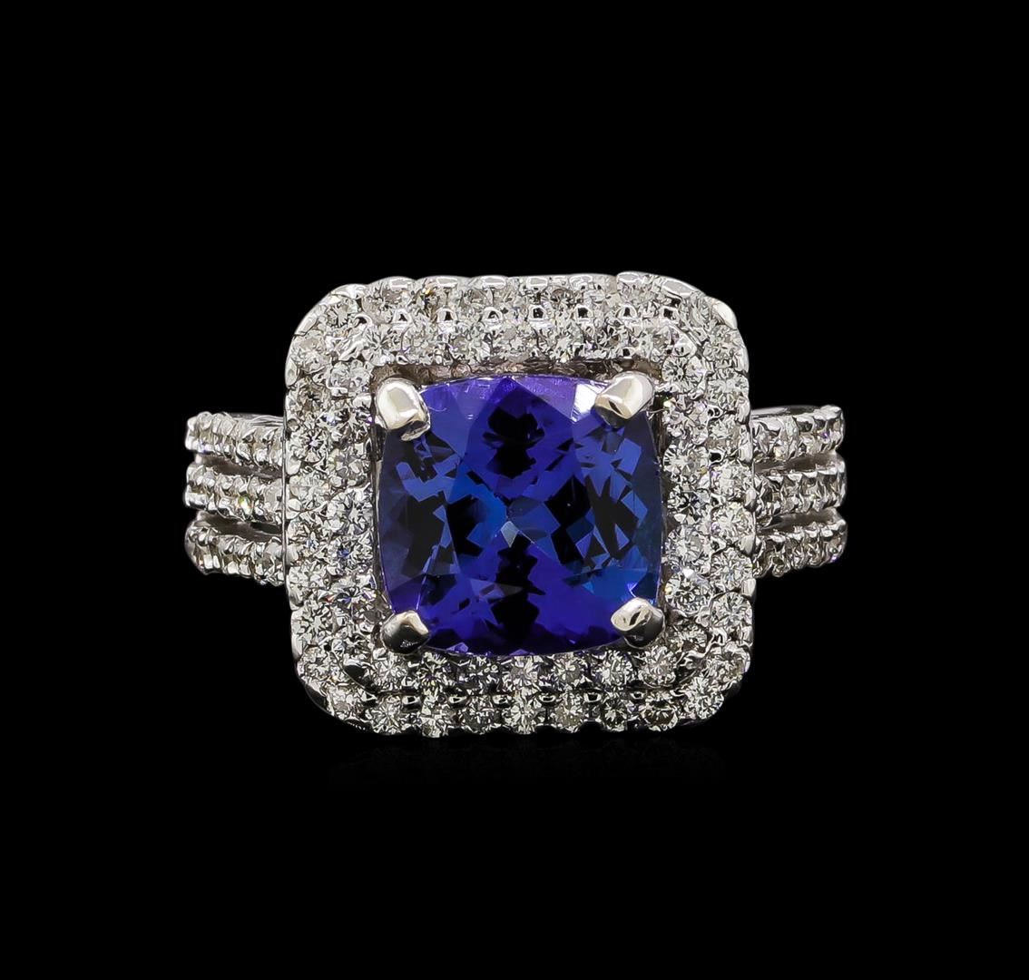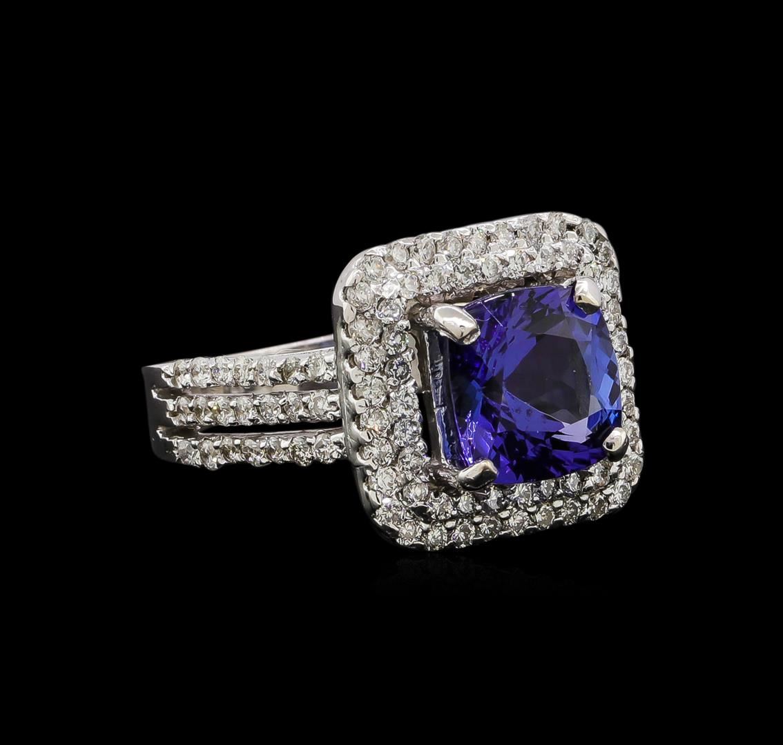 One electronically tested 14KT white gold ladies cast tanzanite and diamond ring with a bright polish finish. Identified with markings of "14KT". Condition is new. Containing: One prong set square cushion modified brilliant cut natural tanzanite, measuring 8.30 x 8.30 x 5.40mm, approximate weight of 2.93ct., clarity is eye clean, type I, medium, very slightly grayish, violet color, (GIA V 5/3), cut is very good. One Hundred Four prong set round brilliant cut diamonds, measuring 1.40 - 1.40 x 0.84mm (depth est.) approximate total weight of 104 Stones = 1.04ct. Clarity: SI-2 to SI-1. Color: I - J, Cut is Good. Colored gemstones are presumed to have been subjected to commonly used enhancement processes. All diamonds and colored gemstones are graded in the mounting, unless otherwise stated. Total Weight of Colored Stones 2.93ct. Total Weight of Diamonds 1.04ct. Total Weight of Ring 6.90 grams. GGL Appraised at $5,825.00.