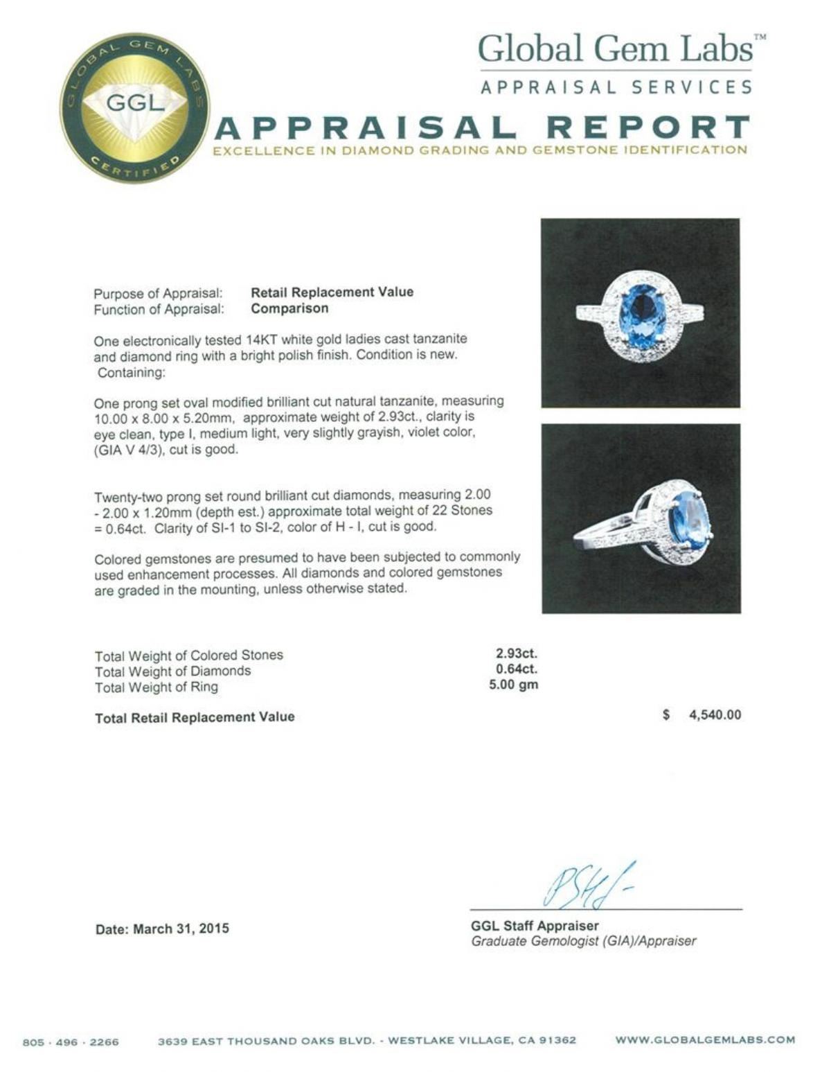 One electronically tested 14KT white gold ladies cast tanzanite and diamond ring with a bright polish finish. Condition is new. Containing: One prong set oval modified brilliant cut natural tanzanite, measuring 10.00 x 8.00 x 5.20mm, approximate weight of 2.93ct., clarity is eye clean, type I, medium light, very slightly grayish, violet color, (GIA V 4/3), cut is good. Twenty-Two prong set round brilliant cut diamonds, measuring 2.00 - 2.00 x 1.20mm (depth est.) approximate total weight of 22 Stones = 0.64ct. Clarity: SI-1 to SI-2. Color: H - I, Cut is Good. Colored gemstones are presumed to have been subjected to commonly used enhancement processes. All diamonds and colored gemstones are graded in the mounting, unless otherwise stated. Total Weight of Colored Stones 2.93ct. Total Weight of Diamonds 0.64ct. Total Weight of Ring 5.00 grams.