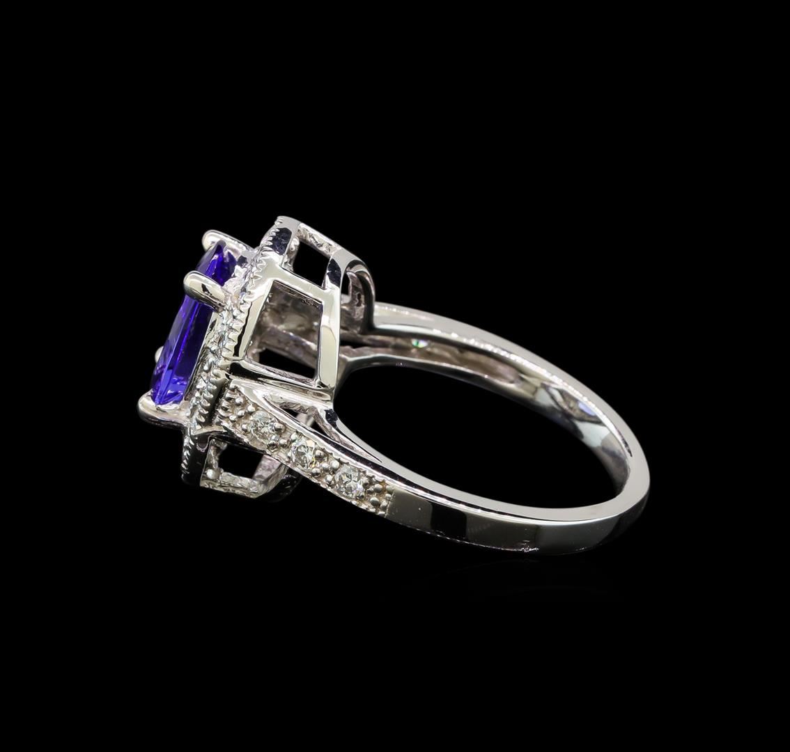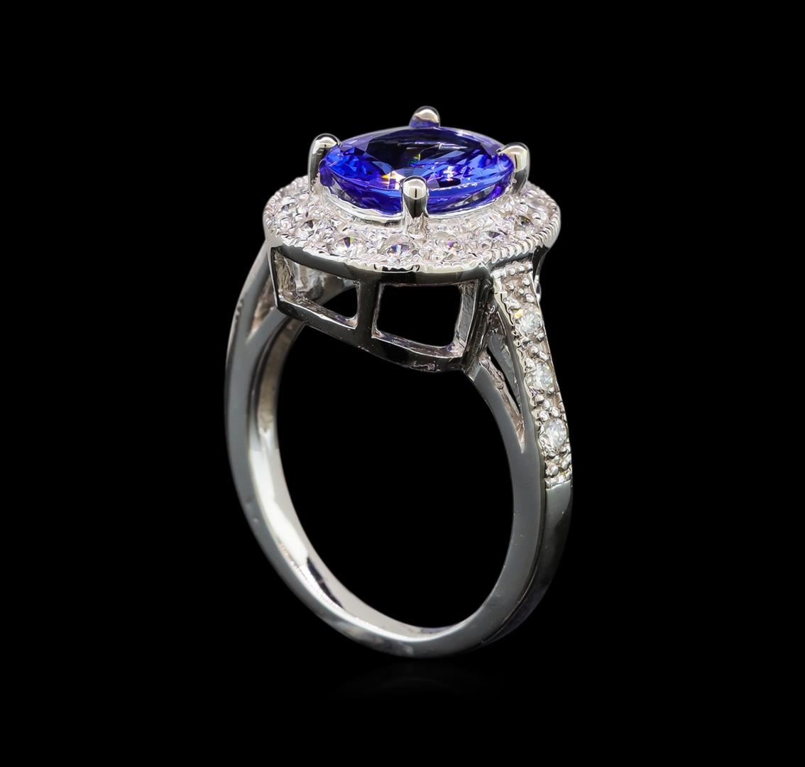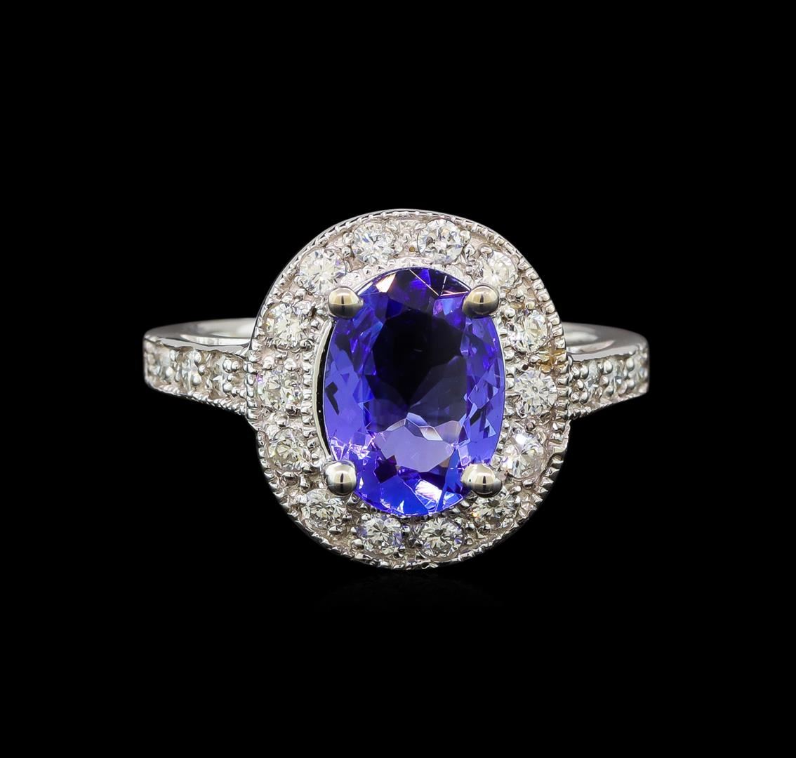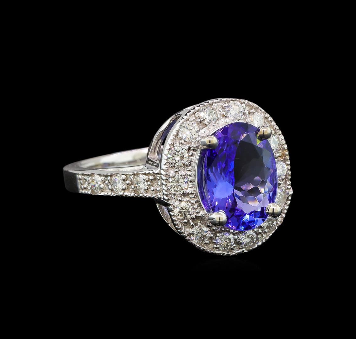 One electronically tested 14KT white gold ladies cast tanzanite and diamond ring with a bright polish finish. Condition is new. Containing: One prong set oval modified brilliant cut natural tanzanite, measuring 10.00 x 8.00 x 5.20mm, approximate weight of 2.93ct., clarity is eye clean, type I, medium light, very slightly grayish, violet color, (GIA V 4/3), cut is good. Twenty-Two prong set round brilliant cut diamonds, measuring 2.00 - 2.00 x 1.20mm (depth est.) approximate total weight of 22 Stones = 0.64ct. Clarity: SI-1 to SI-2. Color: H - I, Cut is Good. Colored gemstones are presumed to have been subjected to commonly used enhancement processes. All diamonds and colored gemstones are graded in the mounting, unless otherwise stated. Total Weight of Colored Stones 2.93ct. Total Weight of Diamonds 0.64ct. Total Weight of Ring 5.00 grams.
