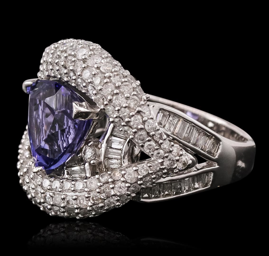 One electronically tested 14KT white gold ladies cast tanzanite and diamond ring with a bright polish finish. The featured tanzanite is set within an elaborate diamond set curvature supported by diamond set shoulders, completed by a two and one-half millimeter wide band. Trademark is Orianne. Identified with markings of "14K". Condition is new, good workmanship. Containing: One prong set triangle brilliant cut natural tanzanite, measuring 9.00 x 8.90 x 5.75mm, 6% bulge factor, approximate weight of 2.94ct., clarity is eye clean, type I, medium dark, very slightly grayish, bluish violet color, (GIA bV 6/3), cut is good. Transmitting light with no distortion, transparent. Graded in the setting. Tanzanite is a very rare gemstone that is only found in the country of Tanzania. Originally discovered in 1967. Tiffany & Company, named the stone Tanzanite. It is found in the Usumburu Mountains that border the Umba Valley of northern Tanzania. Tanzanite occurs in gray, brown, violet, blue, reddish-purple, & green. The gem is interesting because of its exceptional pleochroism. Rotated in different directions a tanzanite will exhibit multiple changes of color. Tanzanite has a low tolerance to ultrasonic cleaning, and should not be cleaned using this method. Eighty-Three prong set round brilliant cut diamonds, measuring 1.50 - 1.30 x 0.84mm (depth est.) approximate total weight of 83 Stones = 0.93ct. Graded in the setting. Clarity: I-2 to I-3. Color: H - J Thirty-Eight channel set baguette cut diamonds, measuring from 2.00 x 1.10 x 0.77mm (depth est.) to 2.10 x 1.20 x 0.84mm (depth est.) approximate total weight of 38 Stones = 0.65ct. Graded in the setting. Clarity: SI-2 to I-1. Color: G - I. Total Weight of Colored Stones 2.94ct. Total Weight of Diamonds 1.58ct. Total Weight of Ring 7.54 grams. AIG Appraised at $11,310.00.