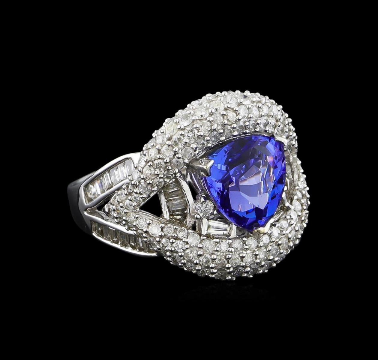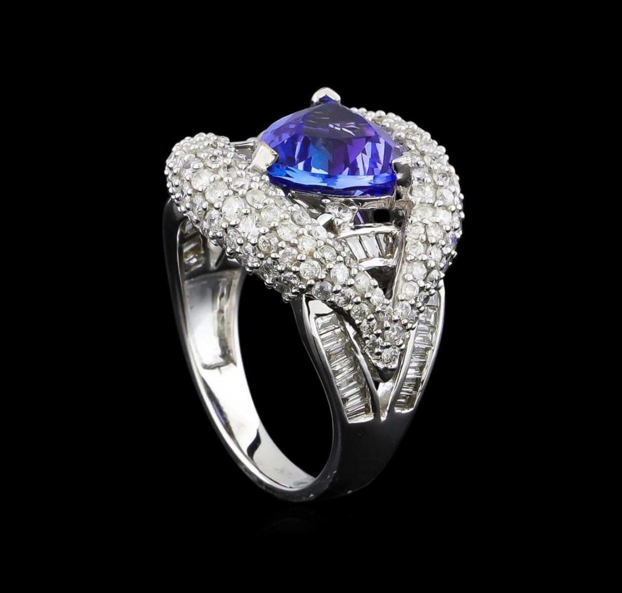 One electronically tested 14KT white gold ladies cast tanzanite and diamond ring with a bright polish finish. The featured tanzanite is set within an elaborate diamond set curvature supported by diamond set shoulders, completed by a two and one-half millimeter wide band. Trademark is Orianne. Identified with markings of "14K". Condition is new, good workmanship. Containing: One prong set triangle brilliant cut natural tanzanite, measuring 9.00 x 8.90 x 5.75mm, 6% bulge factor, approximate weight of 2.94ct., clarity is eye clean, type I, medium dark, very slightly grayish, bluish violet color, (GIA bV 6/3), cut is good. Transmitting light with no distortion, transparent. Graded in the setting. Tanzanite is a very rare gemstone that is only found in the country of Tanzania. Originally discovered in 1967. Tiffany & Company, named the stone Tanzanite. It is found in the Usumburu Mountains that border the Umba Valley of northern Tanzania. Tanzanite occurs in gray, brown, violet, blue, reddish-purple, & green. The gem is interesting because of its exceptional pleochroism. Rotated in different directions a tanzanite will exhibit multiple changes of color. Tanzanite has a low tolerance to ultrasonic cleaning, and should not be cleaned using this method. Eighty-Three prong set round brilliant cut diamonds, measuring 1.50 - 1.30 x 0.84mm (depth est.) approximate total weight of 83 Stones = 0.93ct. Graded in the setting. Clarity: I-2 to I-3. Color: H - J Thirty-Eight channel set baguette cut diamonds, measuring from 2.00 x 1.10 x 0.77mm (depth est.) to 2.10 x 1.20 x 0.84mm (depth est.) approximate total weight of 38 Stones = 0.65ct. Graded in the setting. Clarity: SI-2 to I-1. Color: G - I. Total Weight of Colored Stones 2.94ct. Total Weight of Diamonds 1.58ct. Total Weight of Ring 7.54 grams. AIG Appraised.