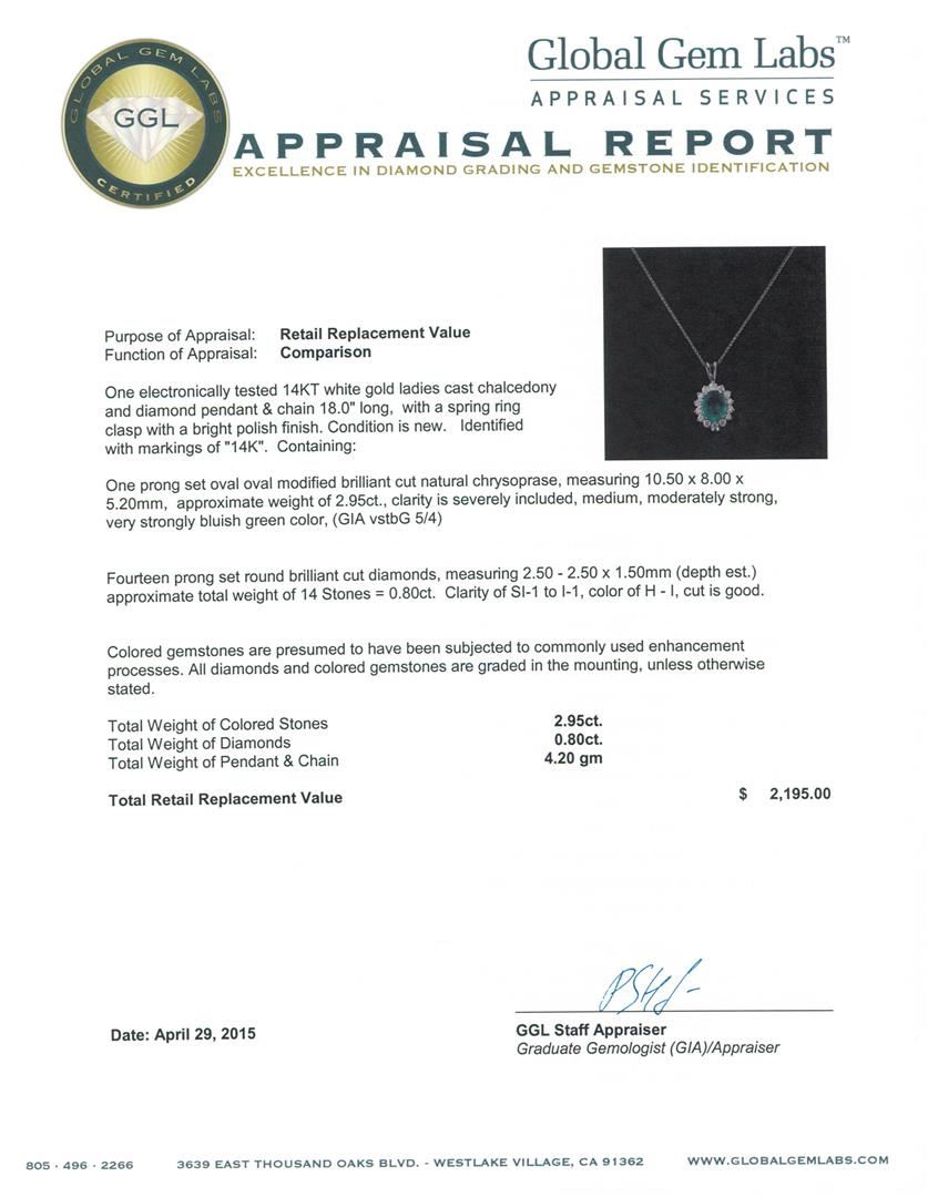One electronically tested 14KT white gold ladies cast chalcedony and diamond pendant & chain 18.0" long, with a spring ring clasp with a bright polish finish. Identified with markings of "14K". Condition is new. Containing: One prong set oval oval modified brilliant cut natural chrysoprase, measuring 10.50 x 8.00 x 5.20mm, approximate weight of 2.95ct., clarity is severely included, medium, moderately strong, very strongly bluish green color, (GIA vstbG 5/4)Fourteen prong set round brilliant cut diamonds, measuring 2.50 - 2.50 x 1.50mm (depth est.) approximate total weight of 14 Stones = 0.80ct. Clarity: SI-1 to I-1. Color: H - I, Cut is Good. Colored gemstones are presumed to have been subjected to commonly used enhancement processes. All diamonds and colored gemstones are graded in the mounting, unless otherwise stated. Total Weight of Colored Stones 2.95ct. Total Weight of Diamonds 0.80ct. Total Weight of Pendant & Chain 4.20 grams. GGL Appraised at $2,195.00.