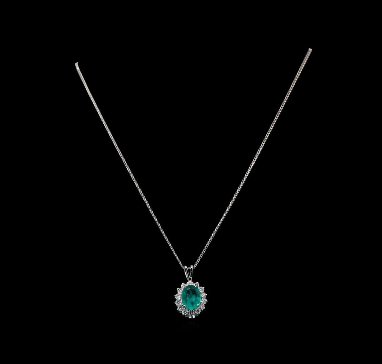 One electronically tested 14KT white gold ladies cast chalcedony and diamond pendant & chain 18.0" long, with a spring ring clasp with a bright polish finish. Identified with markings of "14K". Condition is new. Containing: One prong set oval oval modified brilliant cut natural chrysoprase, measuring 10.50 x 8.00 x 5.20mm, approximate weight of 2.95ct., clarity is severely included, medium, moderately strong, very strongly bluish green color, (GIA vstbG 5/4)Fourteen prong set round brilliant cut diamonds, measuring 2.50 - 2.50 x 1.50mm (depth est.) approximate total weight of 14 Stones = 0.80ct. Clarity: SI-1 to I-1. Color: H - I, Cut is Good. Colored gemstones are presumed to have been subjected to commonly used enhancement processes. All diamonds and colored gemstones are graded in the mounting, unless otherwise stated. Total Weight of Colored Stones 2.95ct. Total Weight of Diamonds 0.80ct. Total Weight of Pendant & Chain 4.20 grams. GGL Appraised.