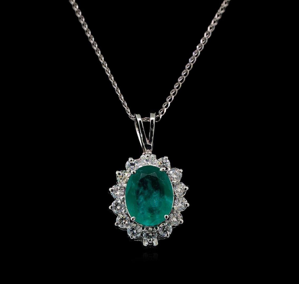 One electronically tested 14KT white gold ladies cast chalcedony and diamond pendant & chain 18.0" long, with a spring ring clasp with a bright polish finish. Identified with markings of "14K". Condition is new. Containing: One prong set oval oval modified brilliant cut natural chrysoprase, measuring 10.50 x 8.00 x 5.20mm, approximate weight of 2.95ct., clarity is severely included, medium, moderately strong, very strongly bluish green color, (GIA vstbG 5/4)Fourteen prong set round brilliant cut diamonds, measuring 2.50 - 2.50 x 1.50mm (depth est.) approximate total weight of 14 Stones = 0.80 ct. Clarity: SI-1 to I-1. Color: H - I, Cut is Good. Colored gemstones are presumed to have been subjected to commonly used enhancement processes. All diamonds and colored gemstones are graded in the mounting, unless otherwise stated. Total Weight of Colored Stones 2.95ct. Total Weight of Diamonds 0.80 ct. Total Weight of Pendant & Chain 4.20 grams. GGL Appraised.