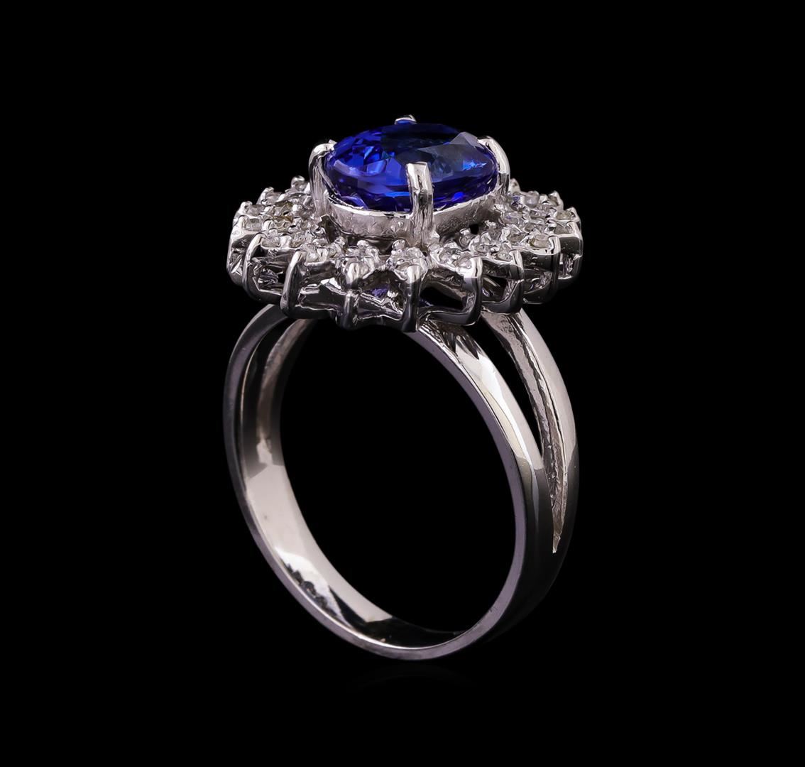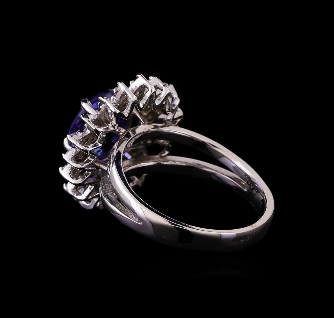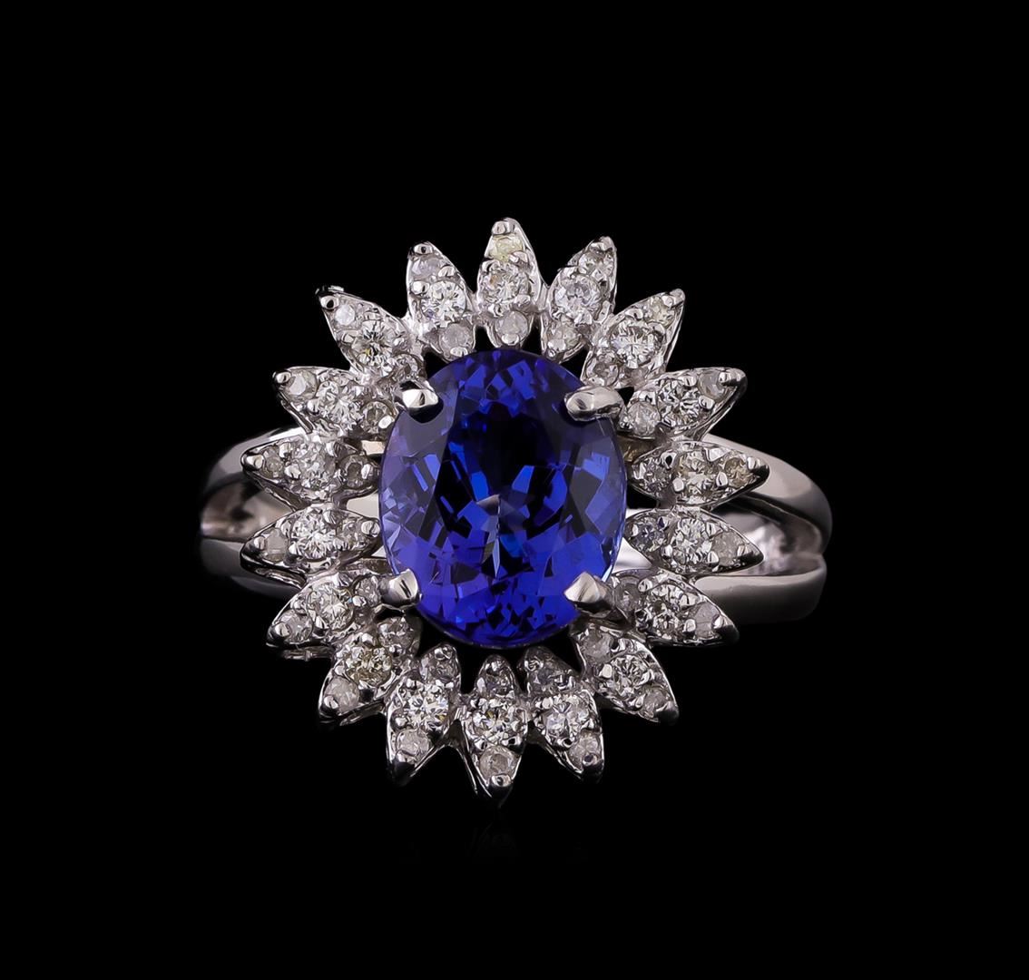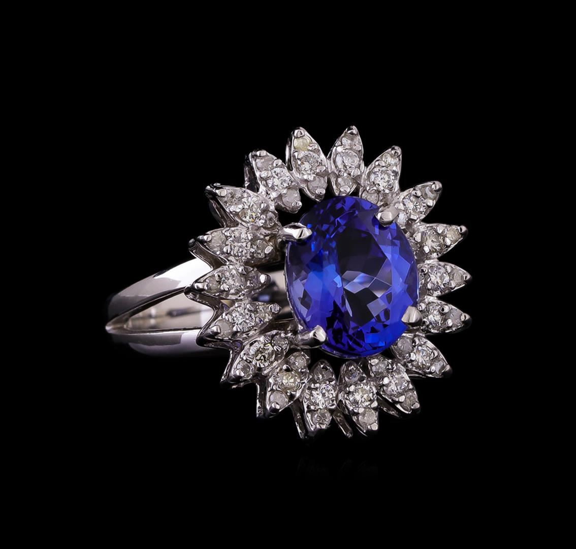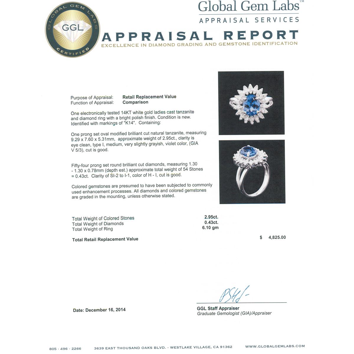 One electronically tested 14KT white gold ladies cast tanzanite and diamond ring with a bright polish finish. Identified with markings of "K14". Condition is new. Containing: One prong set oval modified brilliant cut natural tanzanite, measuring 9.29 x 7.60 x 5.31mm, approximate weight of 2.95ct., clarity is eye clean, type I, medium, very slightly grayish, violet color, (GIA V 5/3), cut is good. Fifty-Four prong set round brilliant cut diamonds, measuring 1.30 - 1.30 x 0.78mm (depth est.) approximate total weight of 54 Stones = 0.43ct. Clarity: SI-2 to I-1. Color: H - I, Cut is Good. Colored gemstones are presumed to have been subjected to commonly used enhancement processes. All diamonds and colored gemstones are graded in the mounting, unless otherwise stated. Total Weight of Colored Stones 2.95ct. Total Weight of Diamonds 0.43ct. Total Weight of Ring 6.10 grams. GGL Appraised at $4,825.00.