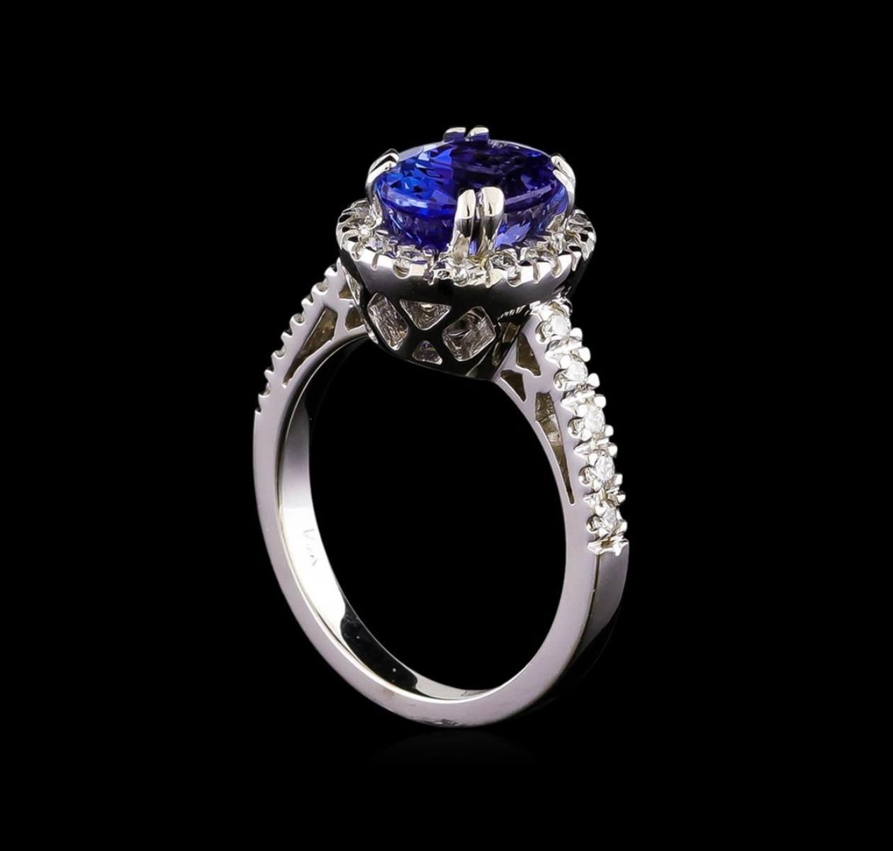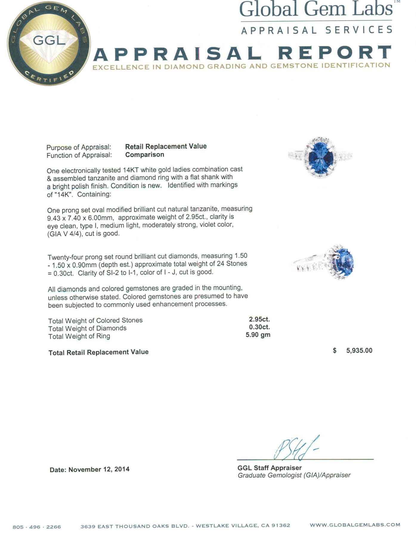 One electronically tested 14KT white gold ladies combination cast & assembled tanzanite and diamond ring with a flat shank with a bright polish finish. Identified with markings of "14K". Condition is new. Containing: One prong set oval modified brilliant cut natural tanzanite, measuring 9.43 x 7.40 x 6.00mm, approximate weight of 2.95ct., clarity is eye clean, type I, medium light, moderately strong, violet color, (GIA V 4/4), cut is good. Twenty-Four prong set round brilliant cut diamonds, measuring 1.50 - 1.50 x 0.90mm (depth est.) approximate total weight of 24 Stones = 0.30ct. Clarity: SI-2 to I-1. Color: I - J, Cut is Good. All diamonds and colored gemstones are graded in the mounting, unless otherwise stated. Colored gemstones are presumed to have been subjected to commonly used enhancement processes. Total Weight of Colored Stones 2.95ct. Total Weight of Diamonds 0.30ct. Total Weight of Ring 5.90 grams. GGL Appraised.