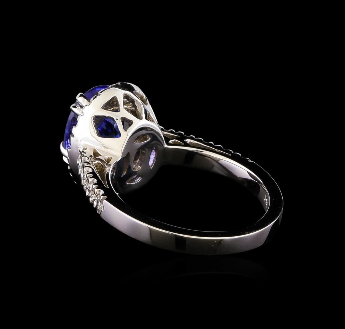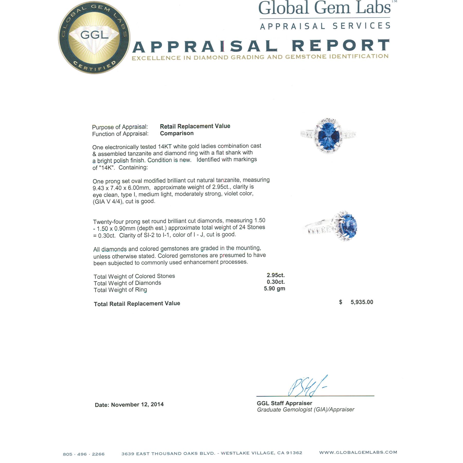 One electronically tested 14KT white gold ladies combination cast & assembled tanzanite and diamond ring with a flat shank with a bright polish finish. Identified with markings of "14K". Condition is new. Containing: One prong set oval modified brilliant cut natural tanzanite, measuring 9.43 x 7.40 x 6.00mm, approximate weight of 2.95ct., clarity is eye clean, type I, medium light, moderately strong, violet color, (GIA V 4/4), cut is good. Twenty-Four prong set round brilliant cut diamonds, measuring 1.50 - 1.50 x 0.90mm (depth est.) approximate total weight of 24 Stones = 0.30 ct. Clarity: SI-2 to I-1. Color: I - J, Cut is Good. All diamonds and colored gemstones are graded in the mounting, unless otherwise stated. Colored gemstones are presumed to have been subjected to commonly used enhancement processes. Total Weight of Colored Stones 2.95ct. Total Weight of Diamonds 0.30 ct. Total Weight of Ring 5.90 grams. GGL Appraised.